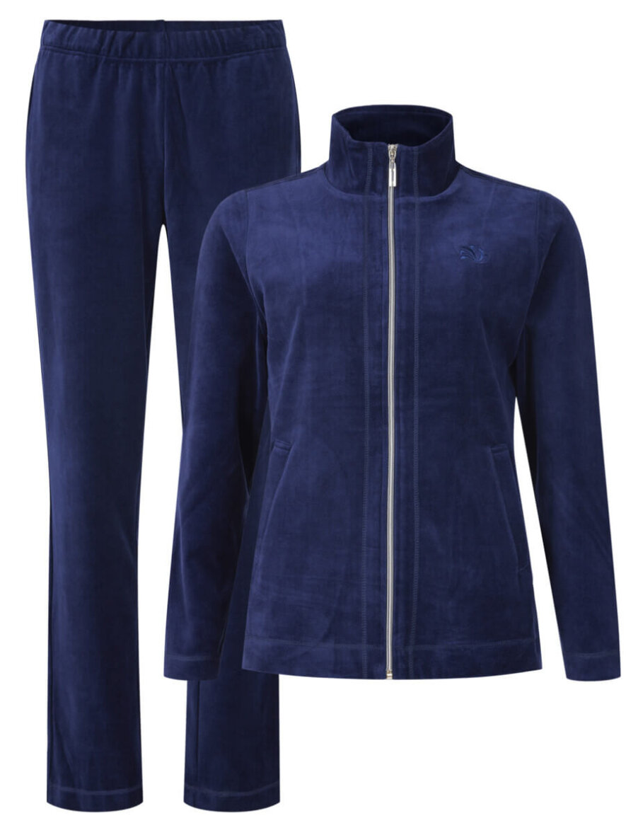 Lækkert blødt joggingsæt fra Brandtex. Sættet er lavet i en dejlig blød velour kvalitet udenpå i en flot marine blå farve - Det perfekte hjemmesæt til afslapning.