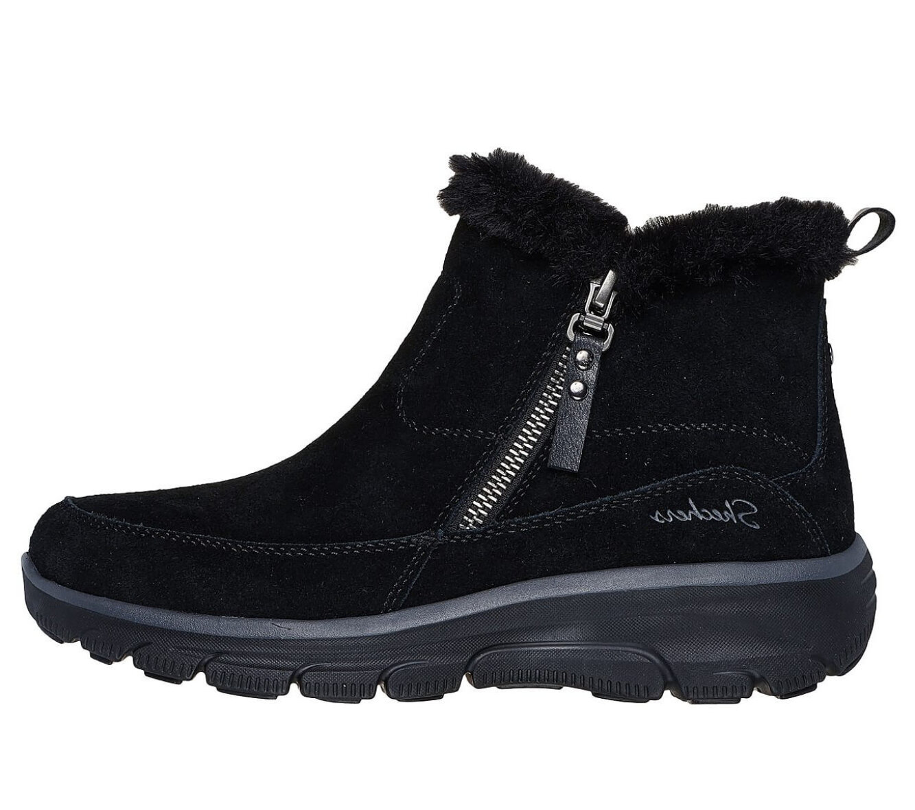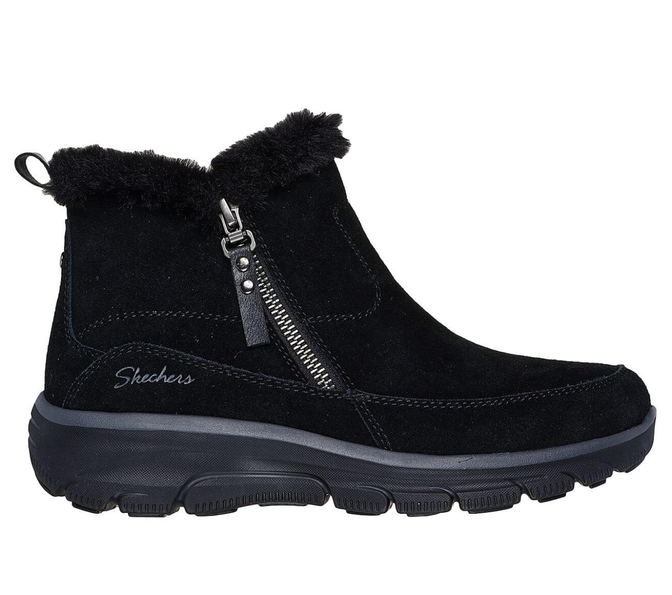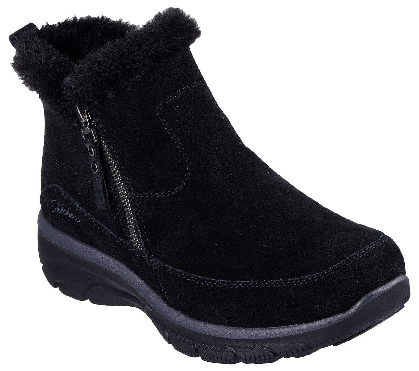 Hold fødderne varme og komfortable hele vinteren med denne sorte ankelstøvle fra Skechers. Overdelen er udført i en blød ruskindskvalitet og varm imiteret pelsforing. Den praktiske lynlås i siden gør den nem at tage af og på, mens den skønne Air-Cooled Memory Foam indersål giver dig blød og støttende komfort hele dagen.