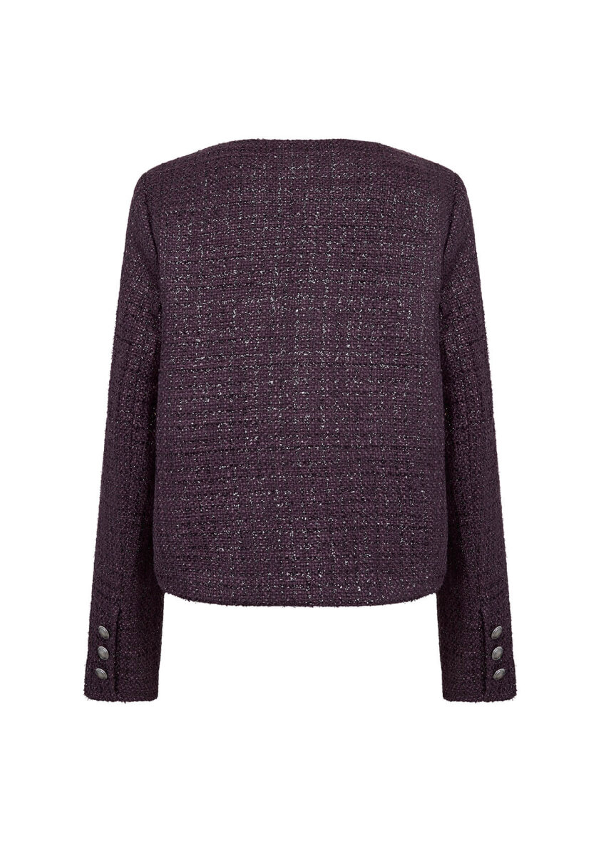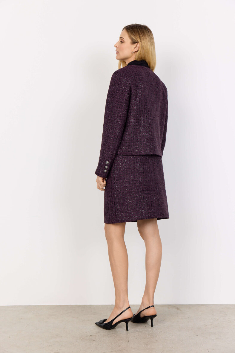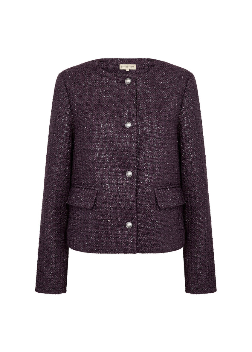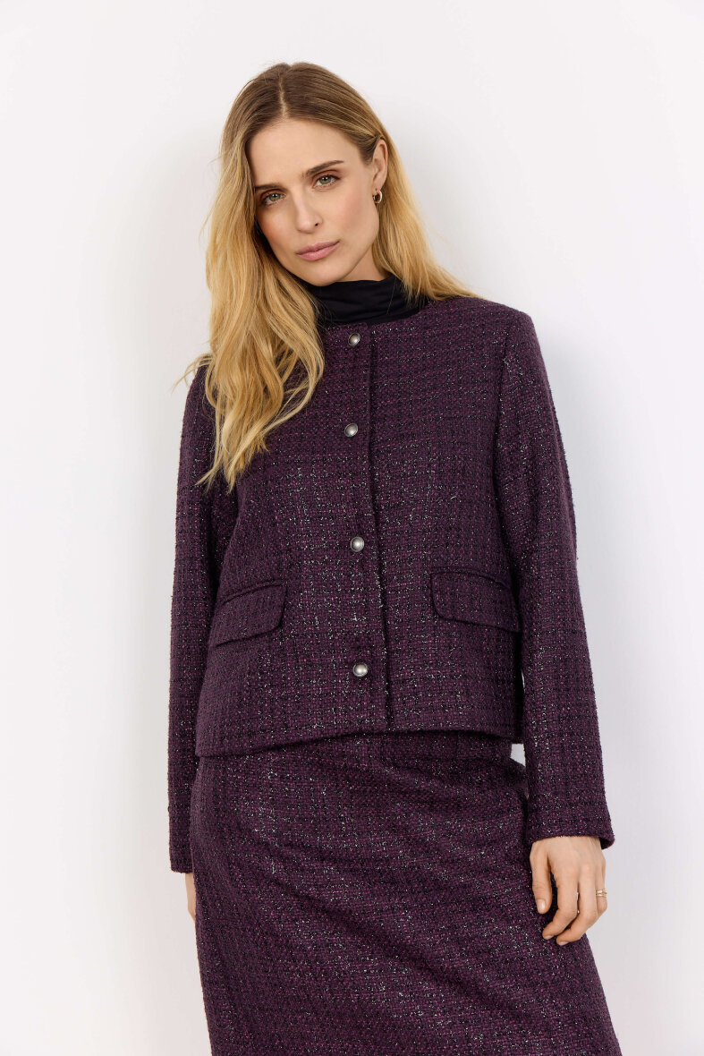 Soyaconcept jakke i et raffineret boucle design med struktur i materialet. Jakken er lavet i en smuk lilla farve med lilla glimmertråde, som danner et ternet design.