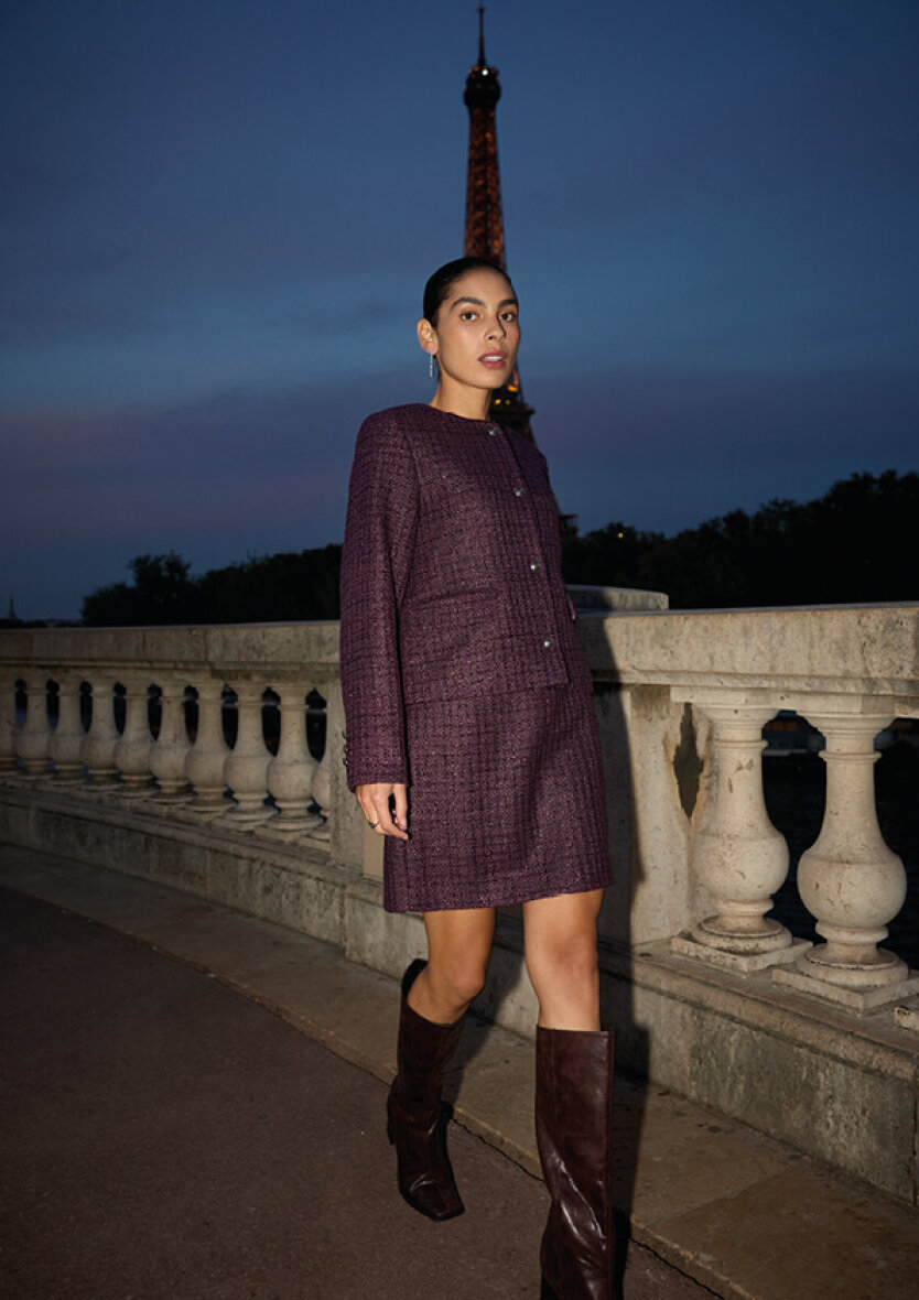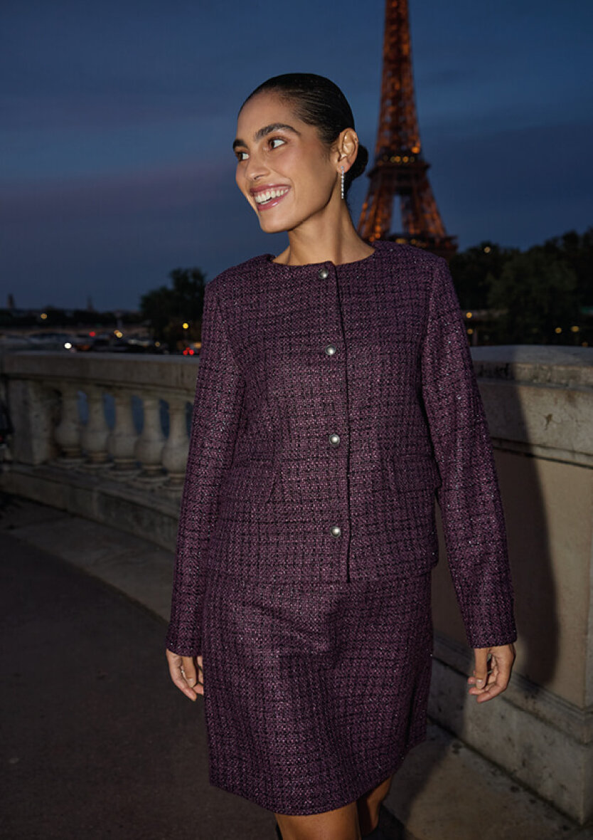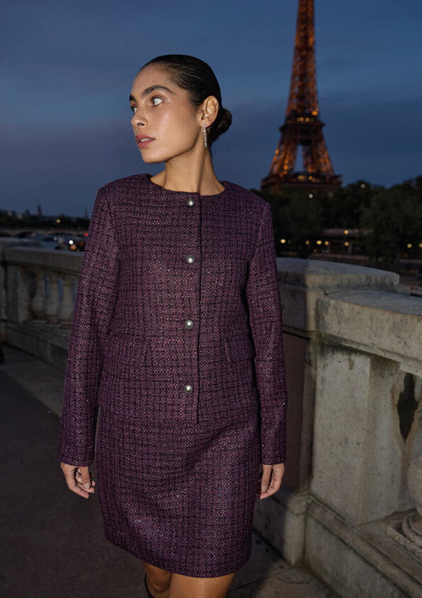 Soyaconcept jakke i et raffineret boucle design med struktur i materialet. Jakken er lavet i en smuk lilla farve med lilla glimmertråde, som danner et ternet design.