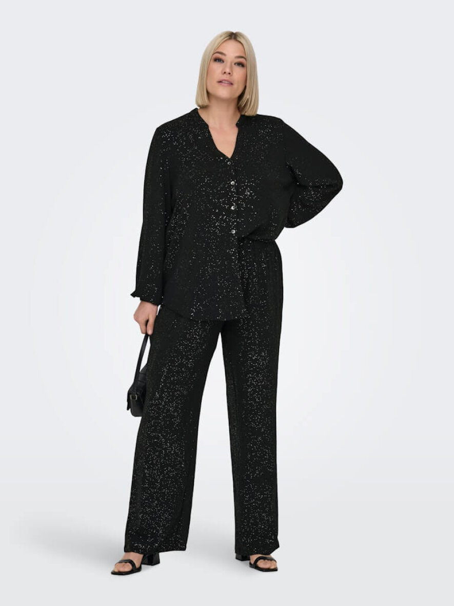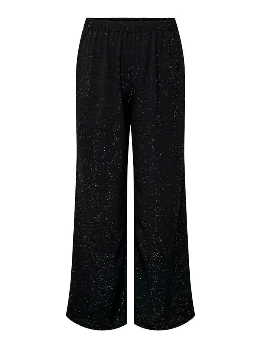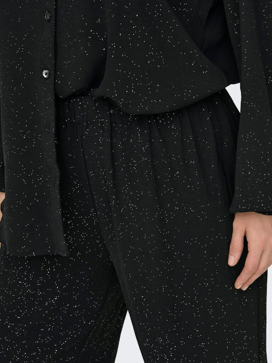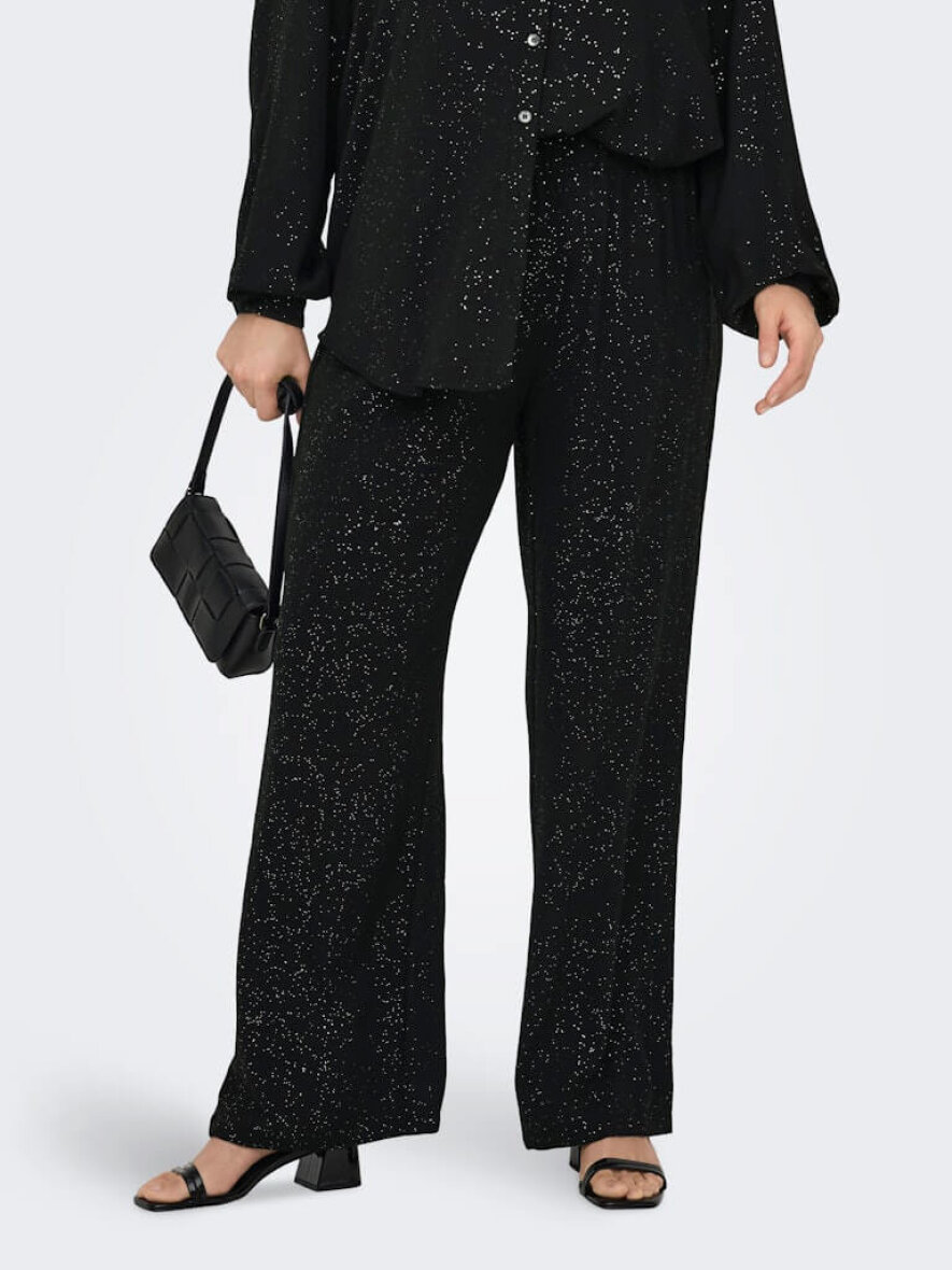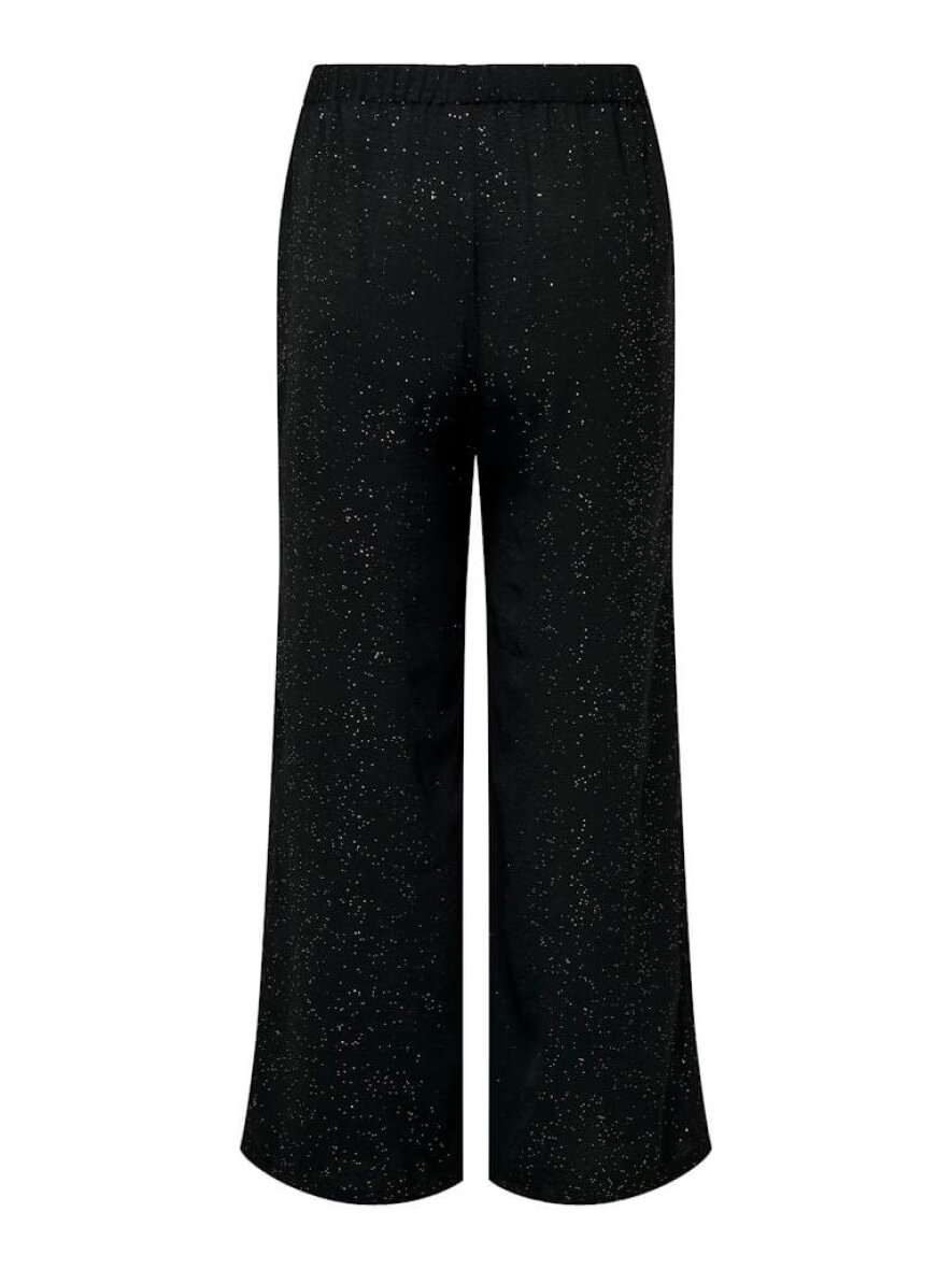 Only Carmakoma sorte bukser med det fineste glimmer design. Et par sorte alsidige bukser som gør sig godt til enhver festlig anledning, eller en hverdag som skal have et pift med glitter og glimmer.
