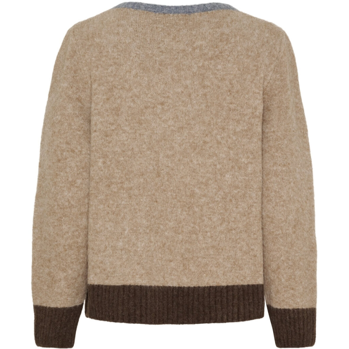 Strikken skiller sig ud med sine kontrastdetaljer: En blå lomme foran, blå rib i halsen og mørkebrune ribkanter på ærmer og bund giver et stilrent, men legende udtryk. Den behagelige pasform og runde hals gør den nem at style over en skjorte eller alene med jeans, leggings eller en nederdel.