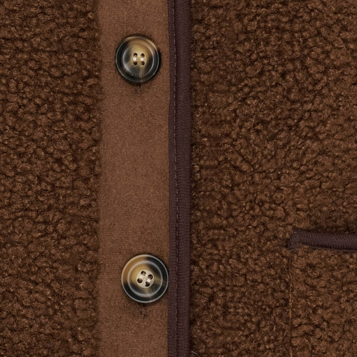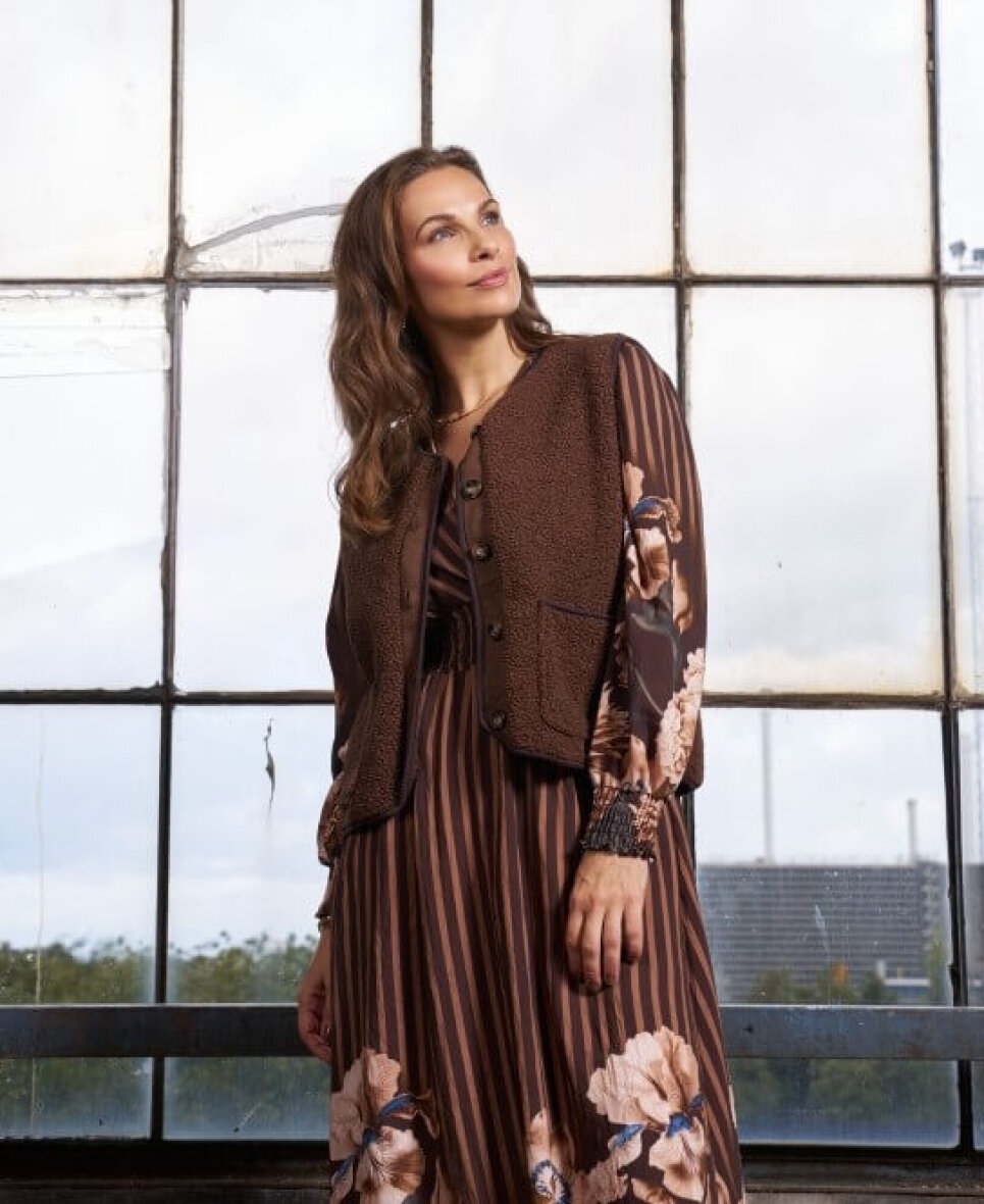 Vesten er lavet i en dyb brun farve og har fine detaljer som knaplukning foran, v-hals og to praktiske lommer. Den enkle, ærmeløse pasform gør den perfekt til lag-på-lag – style den over en skjorte, kjole eller striktrøje for et afslappet, men moderne look. En fin detalje er den mørkebrune kontrastkant som fuldener designet.