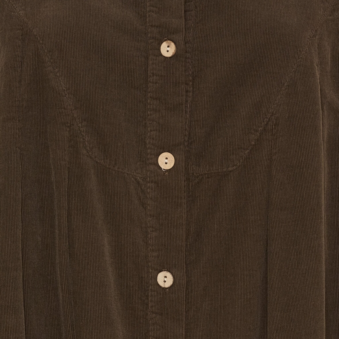 Kjolen er med krave og gennemgående knapper langs fronten. Kjolen er med overskæring på brystet, som danner struktur i stoffet og fortsætter i en flatterende A-form.
