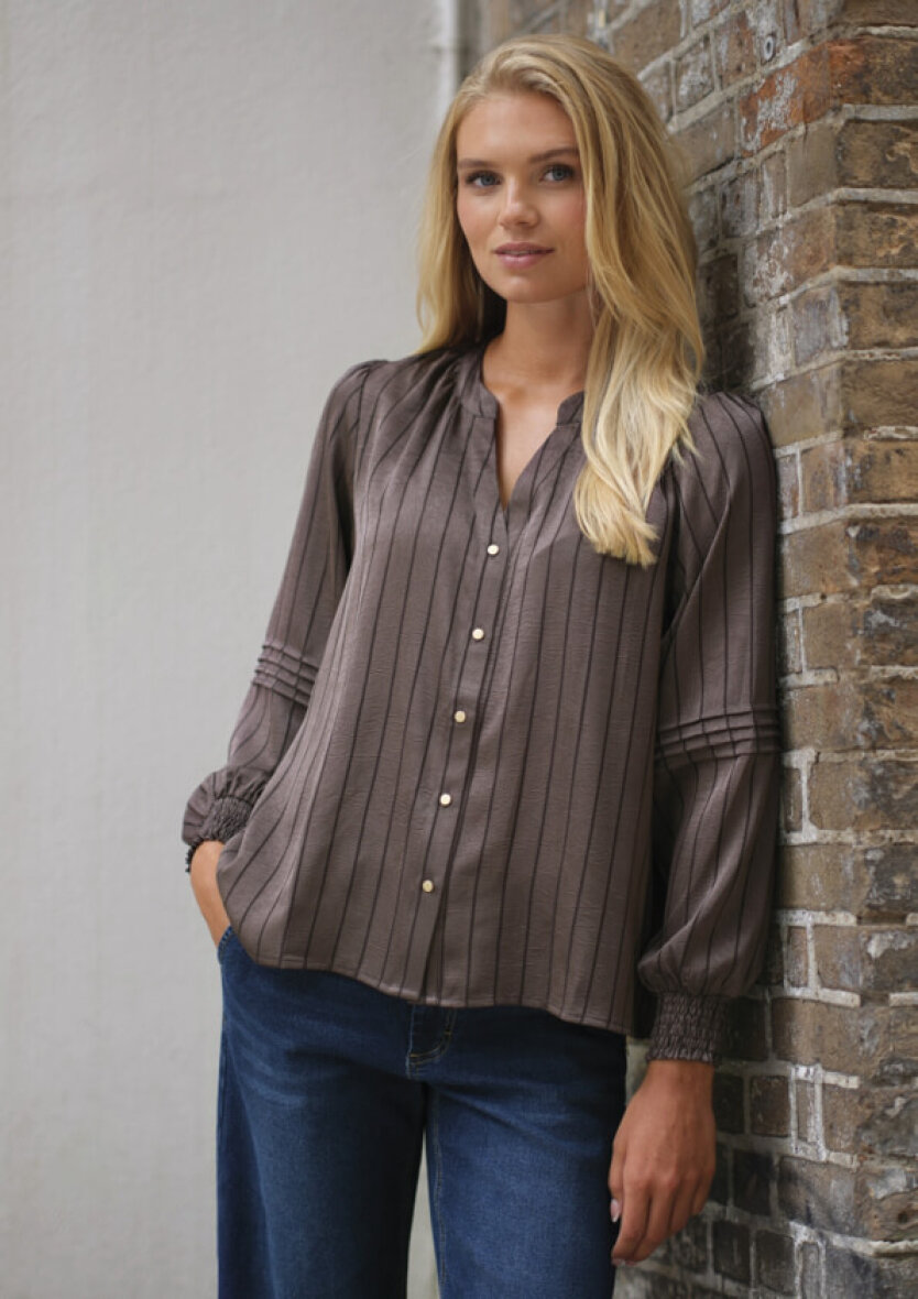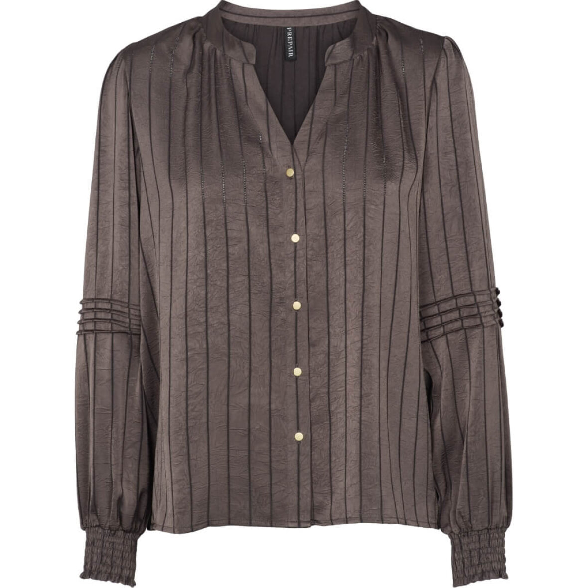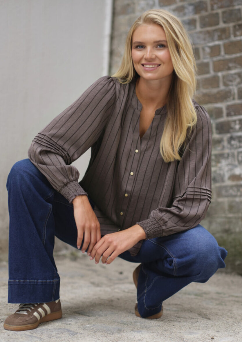 PREPAIR bluse i modellen Eloise er en elegant og feminin bluse i en dyb brunlig tone med lodrette mørke striber. Blusen er lavet i en let skinnende polyester kvalitet, som giver et eksklusivt udtryk.