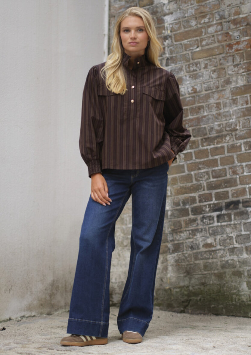 PREPAIR bluse i modellen Sky. Blusen er i en flot brun farve farve med sort/lysebrun stribet design. Blusen er lavet i en lækker bomuldspoplin med smukke brune nuancer.