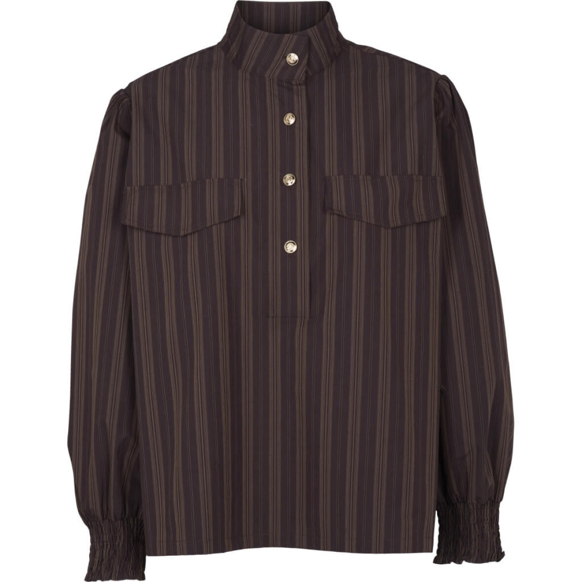 Blusen har en høj stående krave, en stolpelukning med fire markante gyldne knapper foran samt to dekorative brystlommer. Blusen er med lange ærmer og afsluttes med smockkant. Med lille slids i siderne.