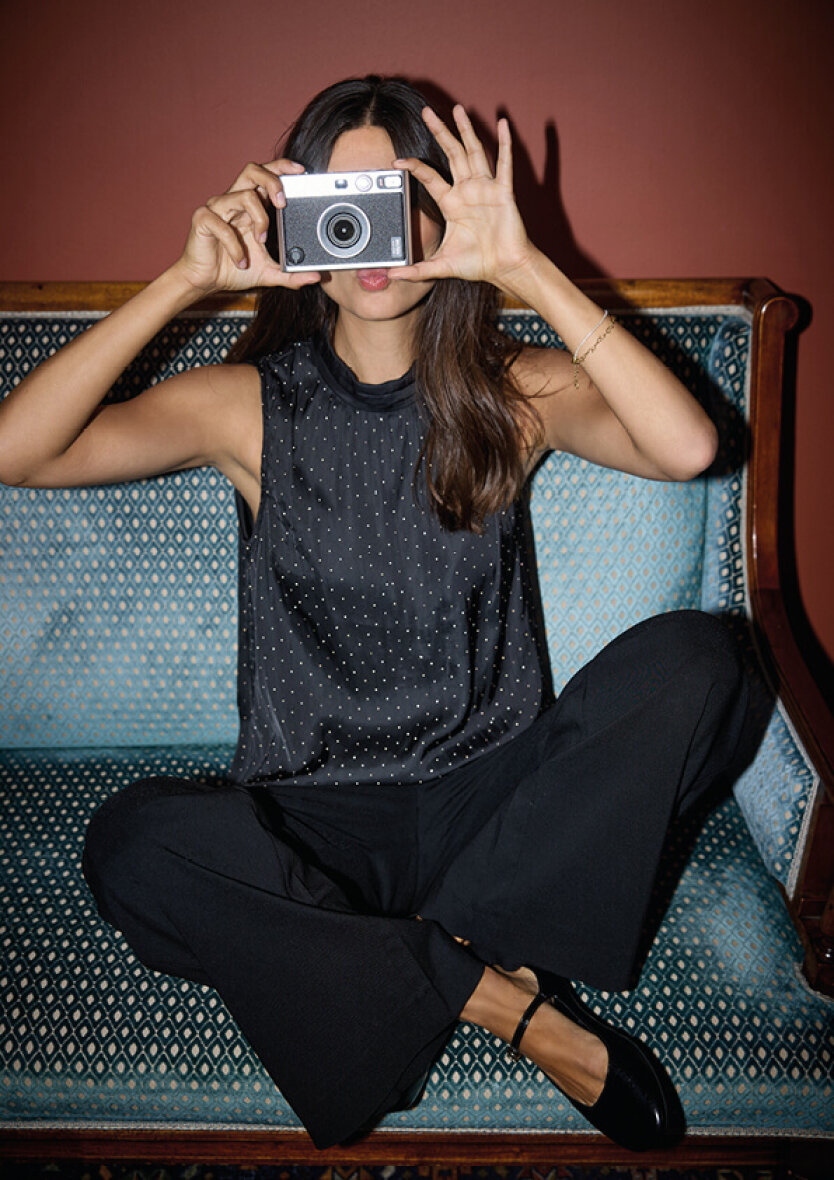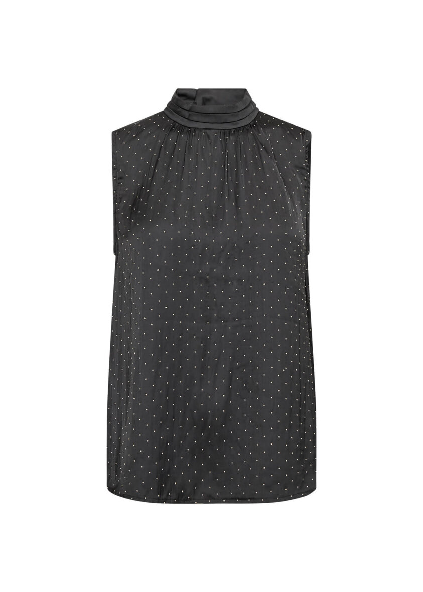 Stilfuld sort top fra Soyaconcept. Toppen er lavet i et let og glansfuldt materiale med et diskret prikmønster af similisten, der tilføjer et raffineret touch.