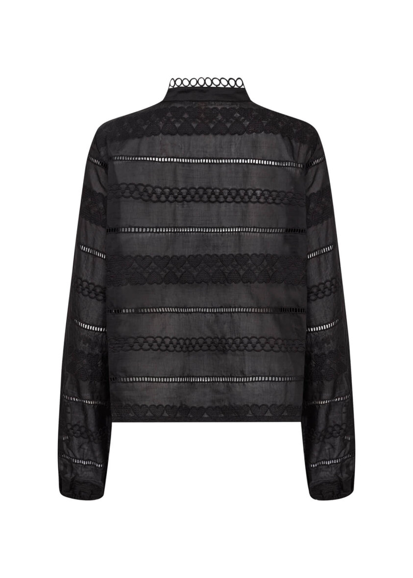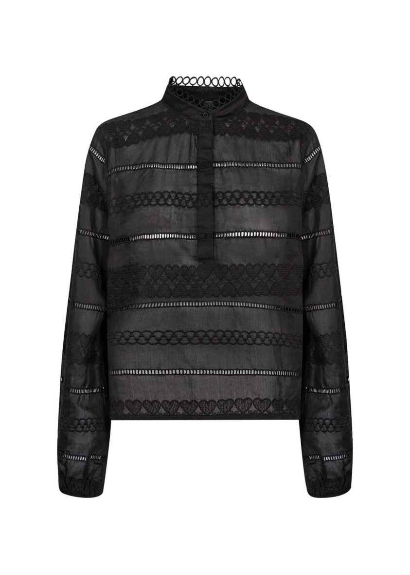 Soyaconcpt bluse i modellen AVA er en elegant sort bluse med de fineste blondedetaljer og feminine hjerte broderinger.