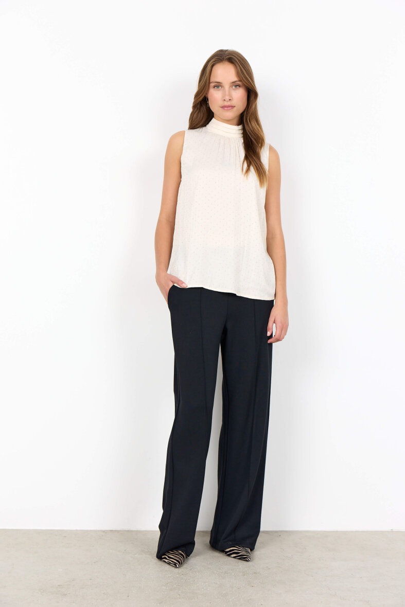 Stilfuld off white top fra Soyaconcept. Toppen er lavet i et let og glansfuldt materiale med et diskret prikmønster af similisten, der tilføjer et raffineret touch.