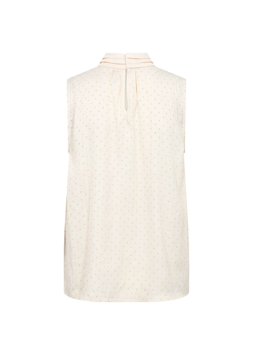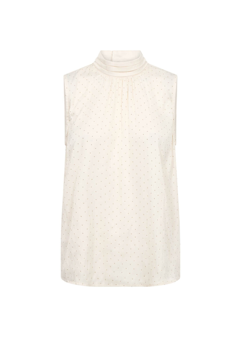 Designet er ærmeløst med en plisseret, høj hals, som lukkes med to trykknapper. Pasformen er afslappet og behagelig, hvilket gør toppen perfekt både til hverdagsbrug og mere festlige anledninger.