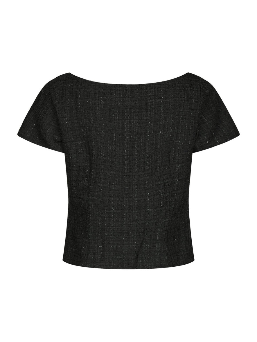 Neo Noir bluse i en lækker bouclé-kvalitet, der giver et eksklusivt og struktureret udtryk med et diskret spil i stoffet. Denne søde, tætsiddende top er både elegant og alsidig – perfekt til både hverdagsbrug og mere festlige anledninger. Tango Boucle blusen har korte ærmer og en smuk bådudskæring, som fremhæver hals og skuldre på en feminin måde