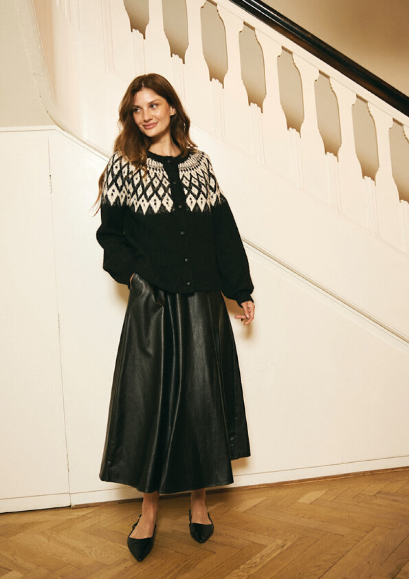 Soulmate strikcardigan i modellen Brigitta. Cardiganen er med sort base og hvid mønster på den øverste del af strikken.