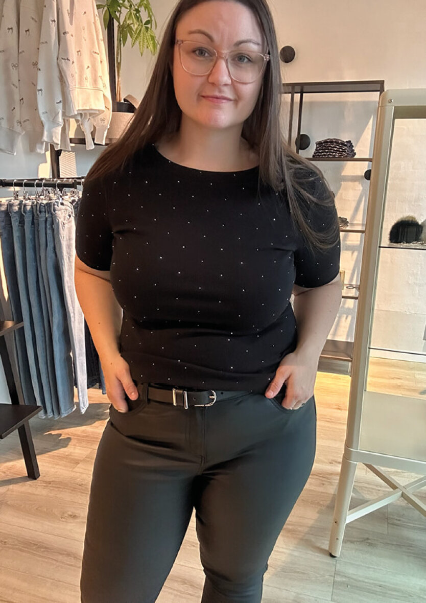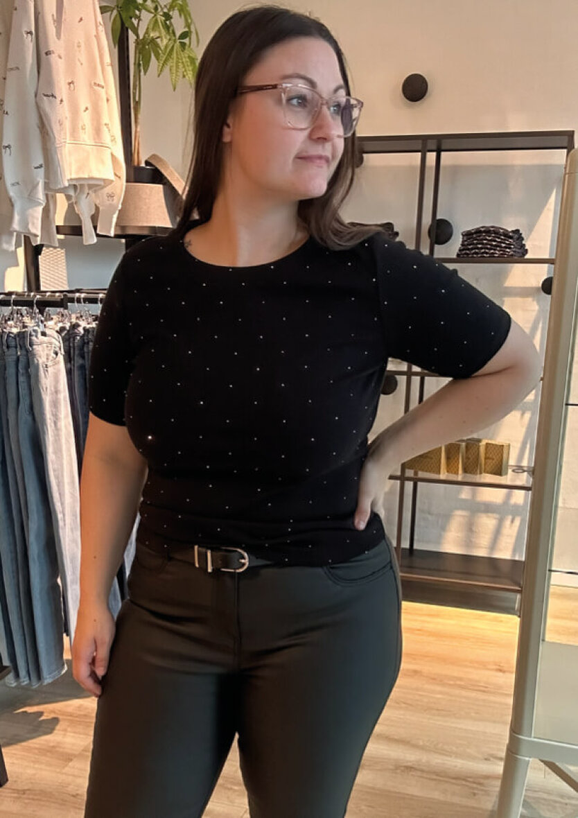 Et skønt item som gør sig godt i basis garderoben, da den kan bruges til både hverdagslook og festlige arrangementer. Bær den for sig selv eller style med jeans, nederdele, bukser alt efter humør. T-shirten er også perfekt under en klassisk blazer, denim jakke eller åben cardigan, for et smart outfit.