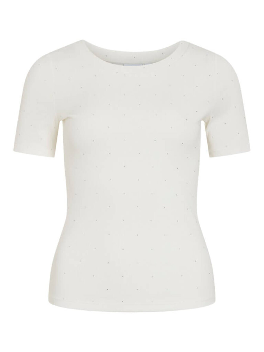 VILA t-shirt i en klassisk hvid farve med ribkvalitet med stretch. T-shirten er med et diskret prikmønster af similisten, der tilføjer et raffineret touch.
