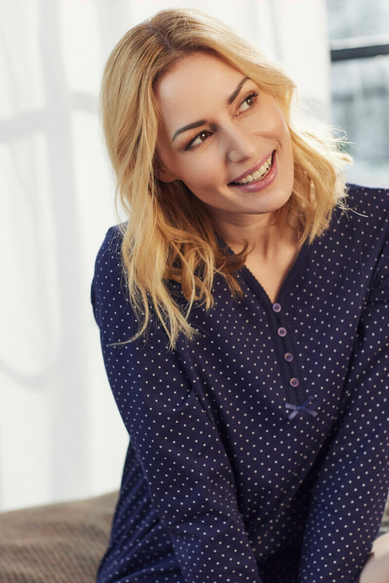 Brandtex natkjole i en flot marine blå farve og et fint hvid prikket design. Natkjolen er med v-halsudskæring, som fortsætter i knapper og stolpeluk, som afsluttes med en lille marine blå sløjfe.