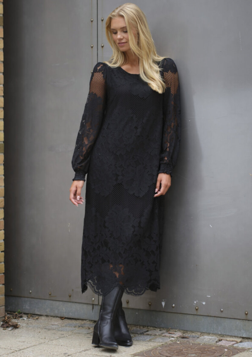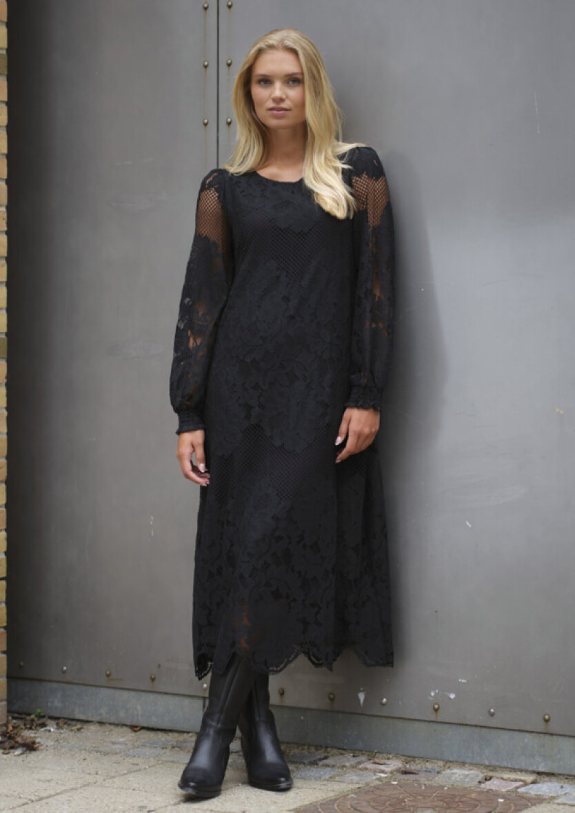 PREPAIR kjole i modellen MILA. En smuk og elegant sort blondekjole med fine, gennemarbejdede detaljer. Kjolen har en rund halsudskæring og lange, gennemsigtige ærmer med smock ved håndleddene. Den har en løs og flatterende pasform, der falder smukt om kroppen. Kjolen er foret på kroppen, mens ærmerne forbliver transparente og skaber et let, sofistikeret udtryk. Bagpå lukkes den med en lille knap i nakken.