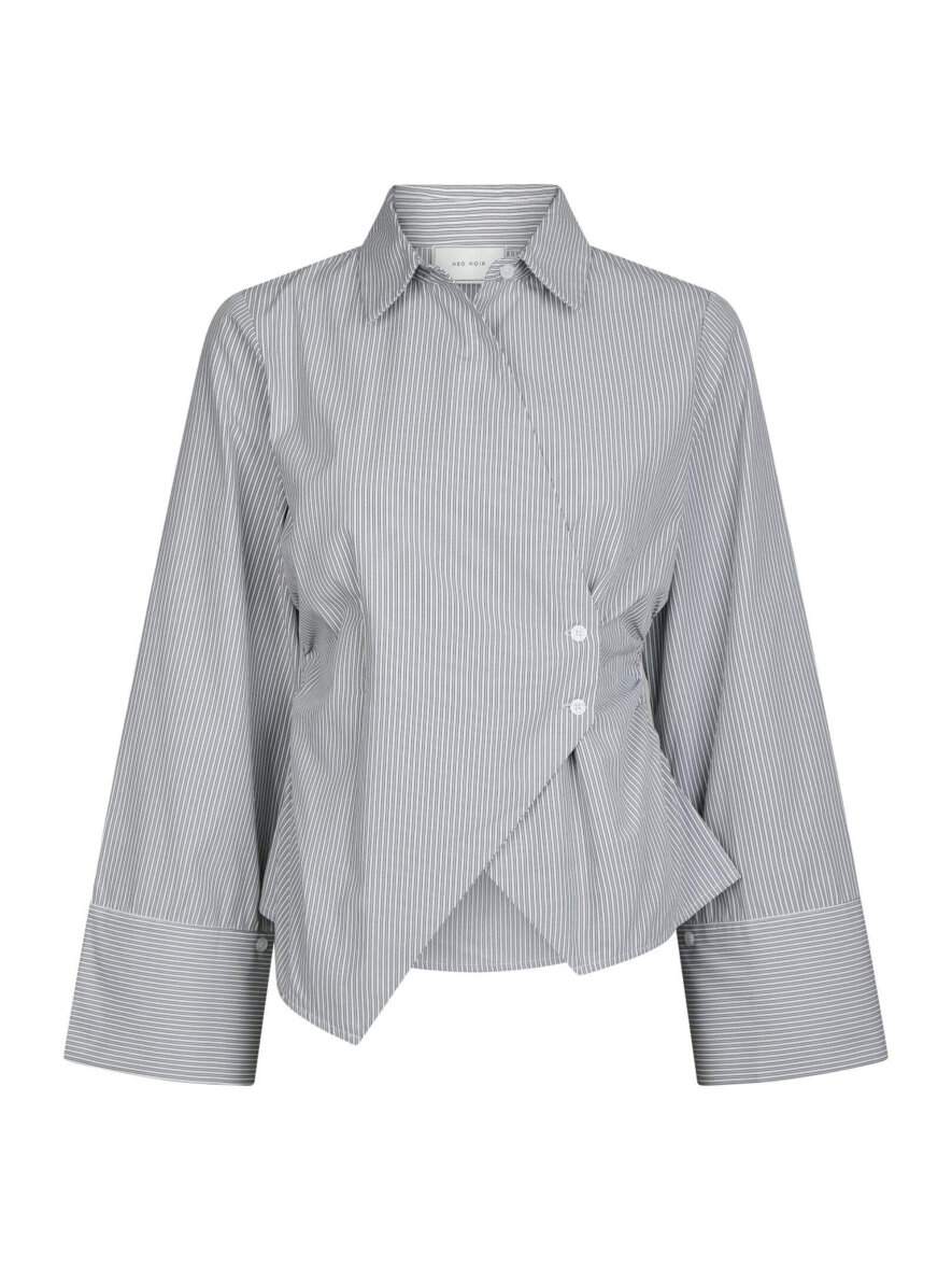 Neo Noir grå/hvid stribet skjorte i modellen Fenli. Skjorten er et moderne take på den klassiske stribede skjorte – elegant, men med et afslappet twist. Designet har en flatterende, let asymmetrisk lukning foran, som tilfører et stilrent og unikt udtryk. De brede manchetter og de fine, lodrette striber giver et sofistikeret look, der både fungerer til kontoret og i mere casual sammenhænge. Skjorten er med fine rynkedetaljer i siderne, som skaber lidt facon.