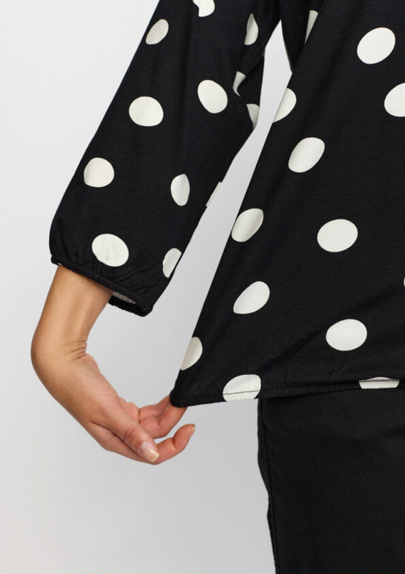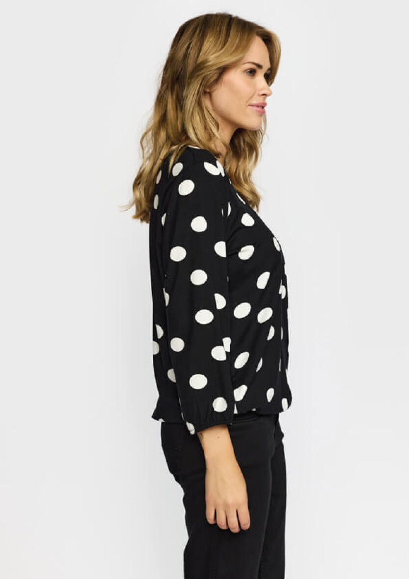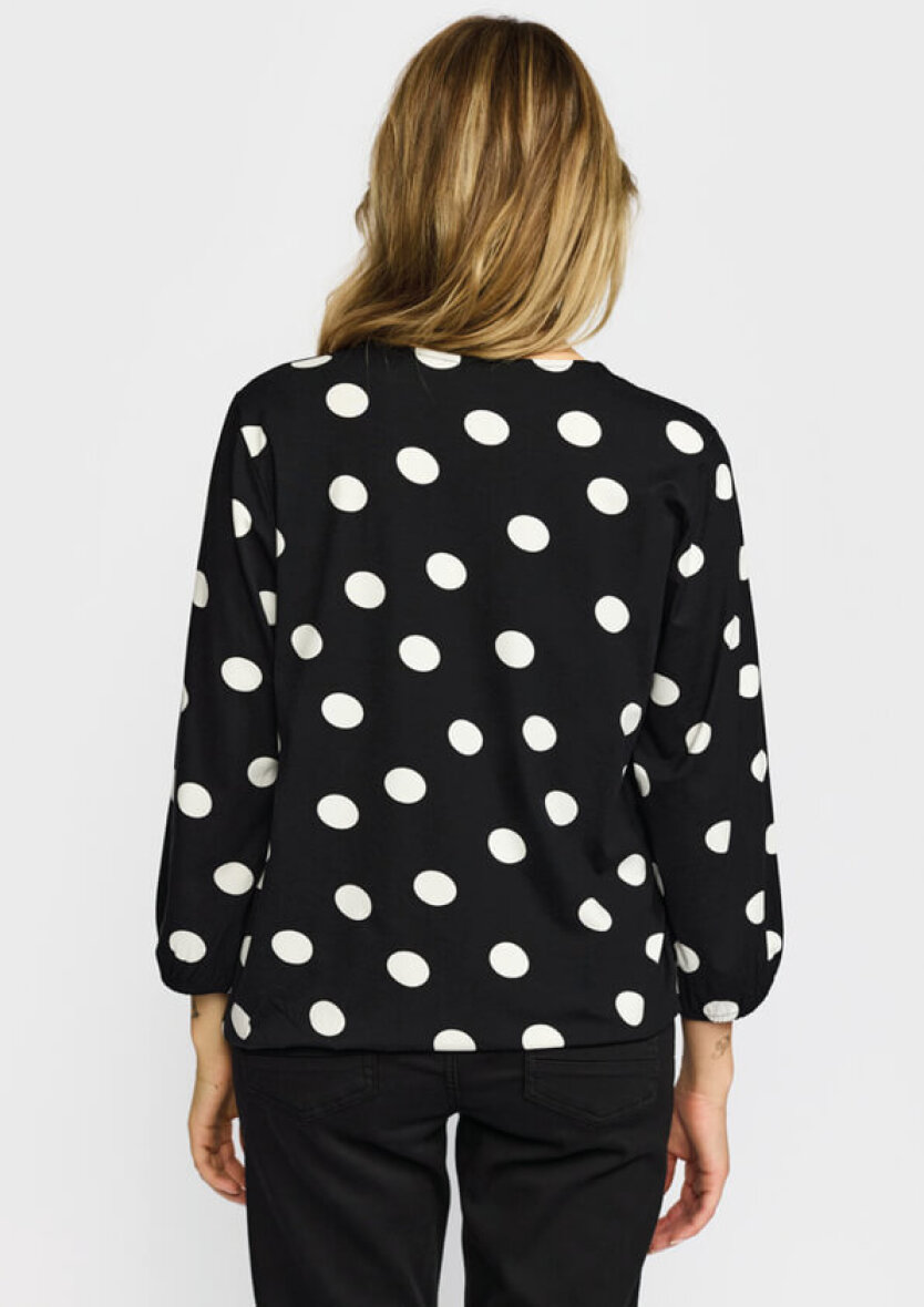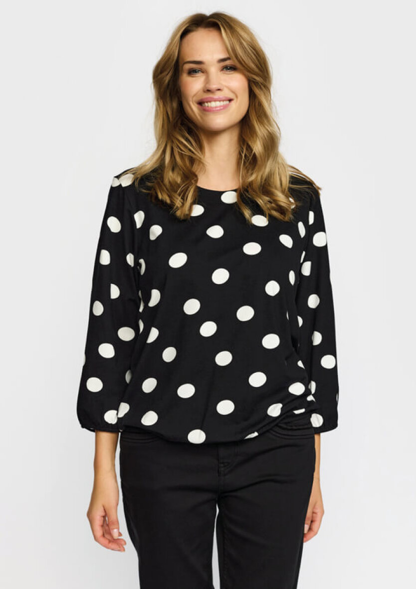 2-Biz bluse i modellen Tandy. Blusen er lavet i en sort base farve med hvid prikket design. Et moderne print som er nem at style med både nederdele, bukser og jeans.