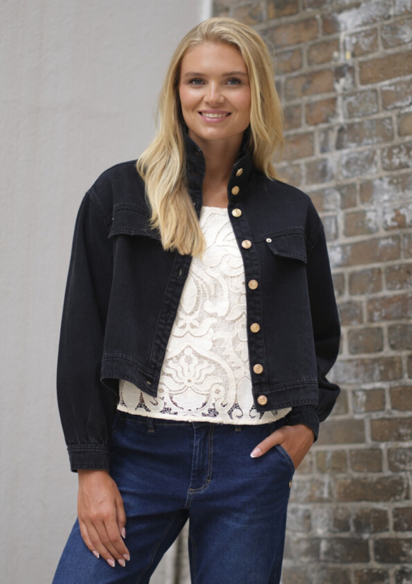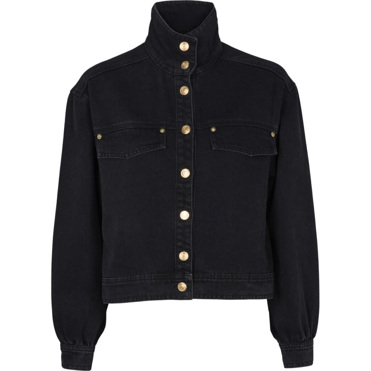 PREPAIR jakken i modellen Frederikke er en skøn, kort og oversized sort denimjakke. Den har en løs, let boxy pasform med høj hals og lange ærmer afsluttet med manchetter.