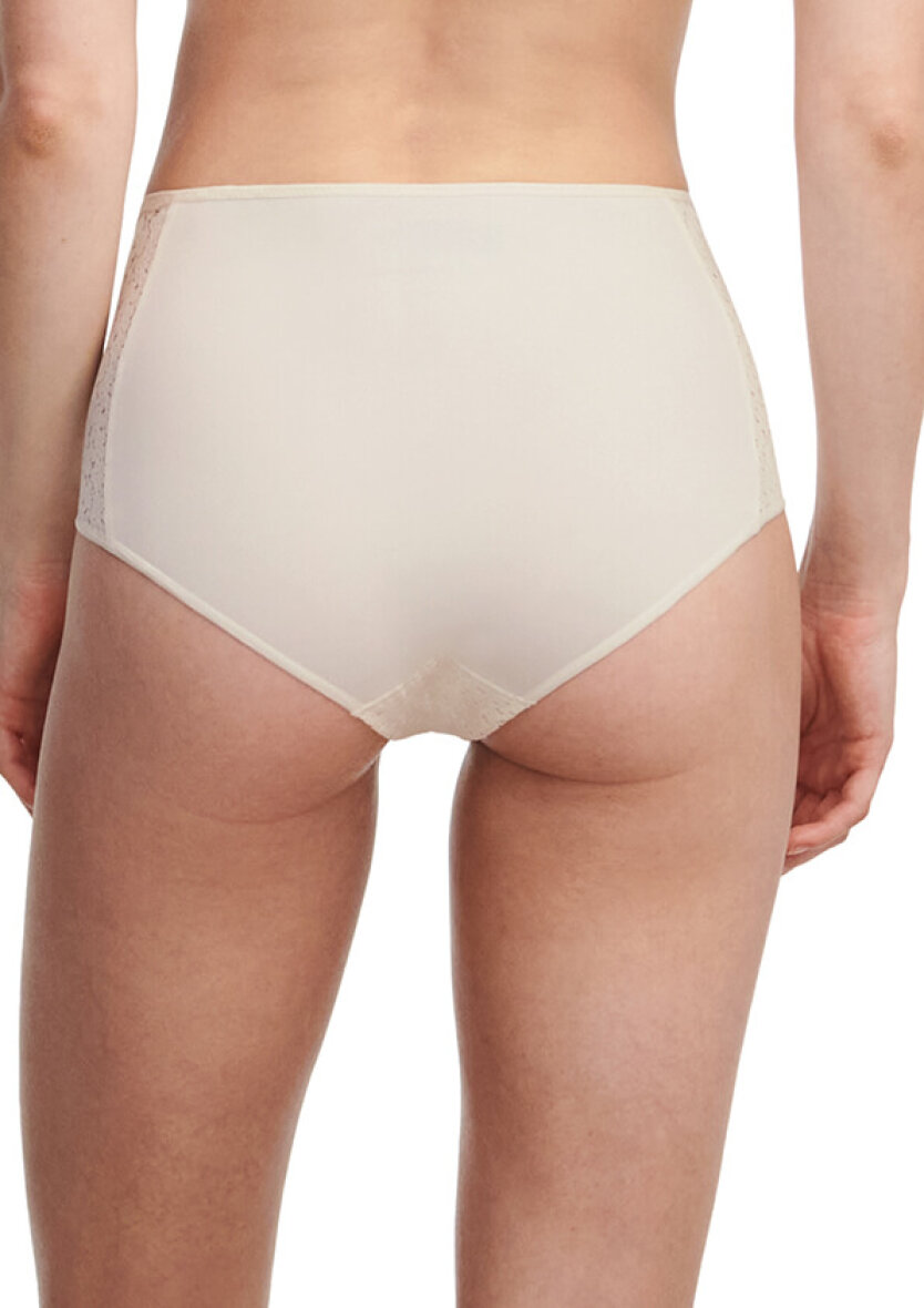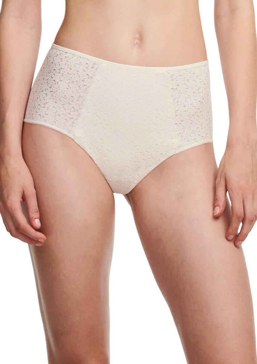 Norah trusser med blonder i en flot perlemors farve fra Chantelle. Maxi trussen er med høj tajle og har et klassisk C-snit. Trussen er med bred kant i siden med semitransparante stykker med blomstret mønster.