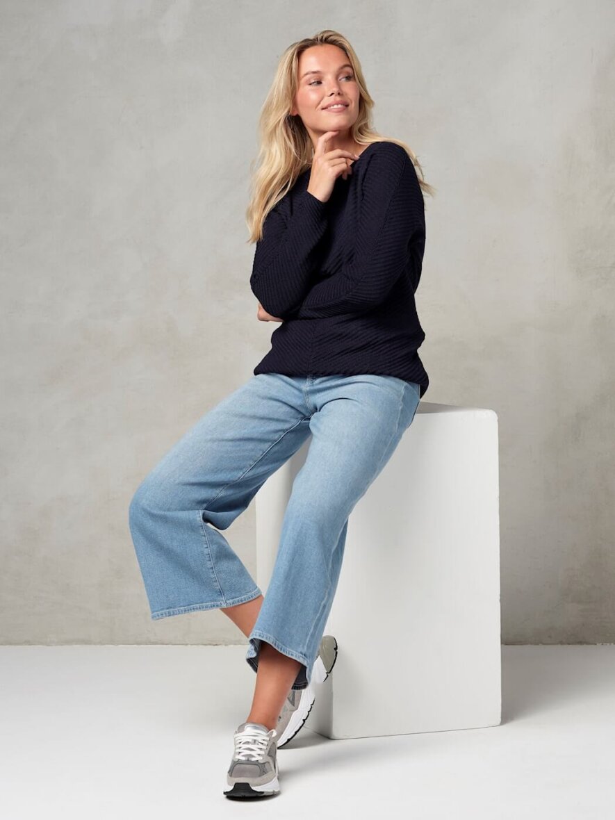 Skovhuus striktrøje i en alsidig marine blå farve, som er nem at style til både jeans, bukser og nederdele for et casual og stilrent look. Perfekt til lag-på-lag og sæsonens kølige dage.