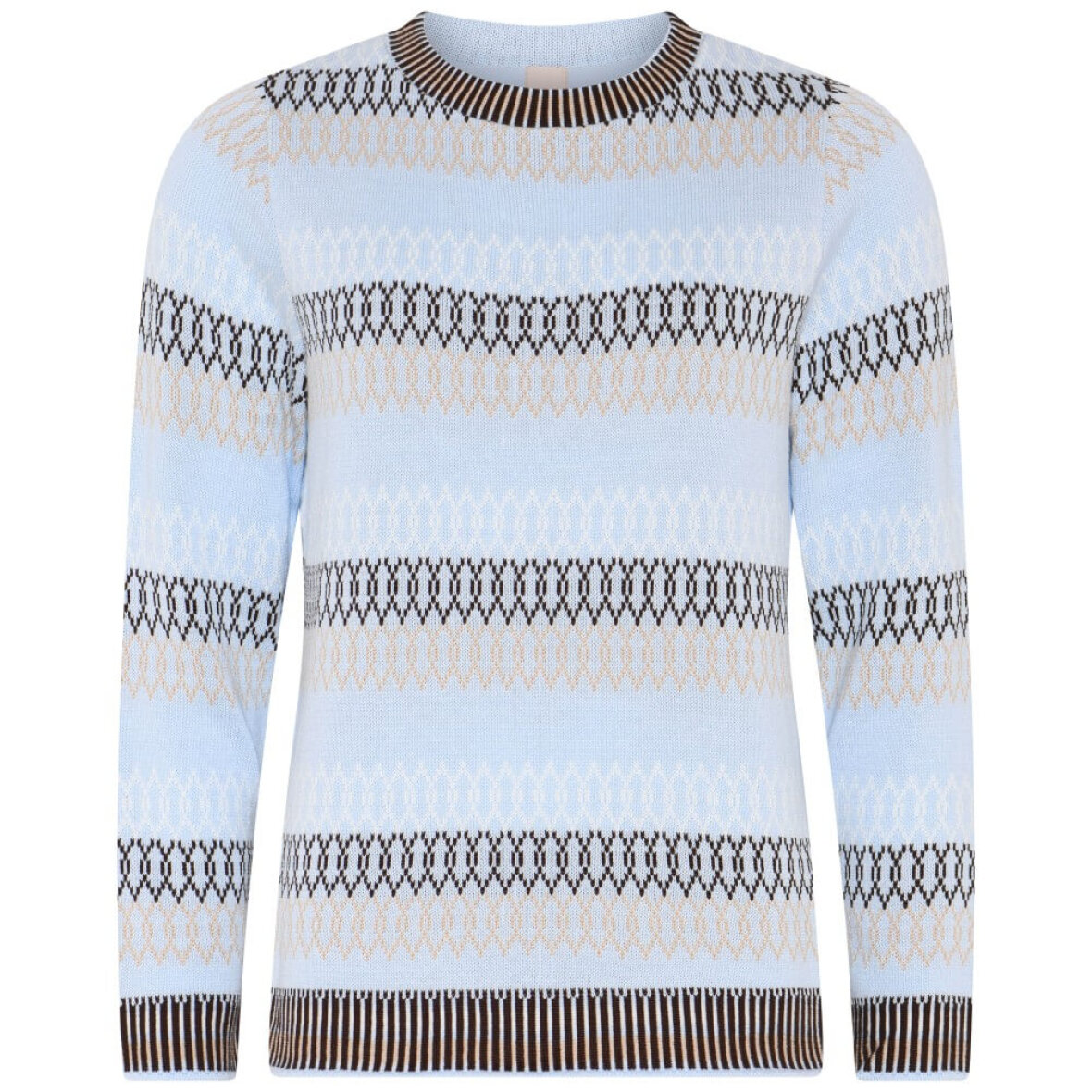 Skovhuus striktrøje i en flot Peal blue base farve med et diskret mønster i hvid, brun og beige toner samt brunstribet kontrastkant med rib ved alle åbninger, hvilket skaber et smukt design.