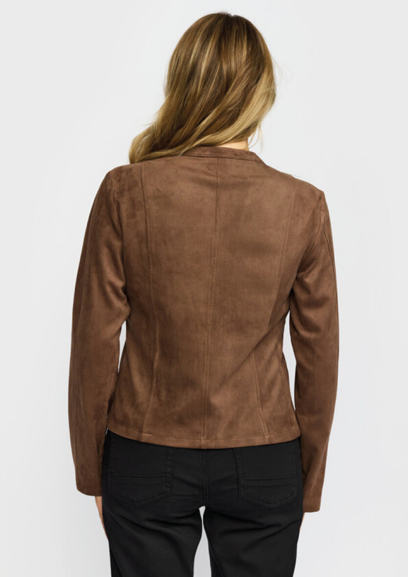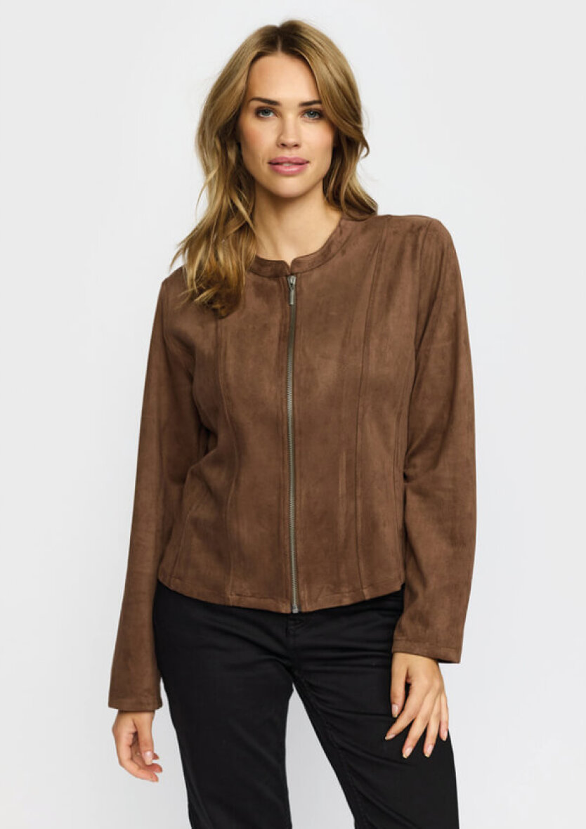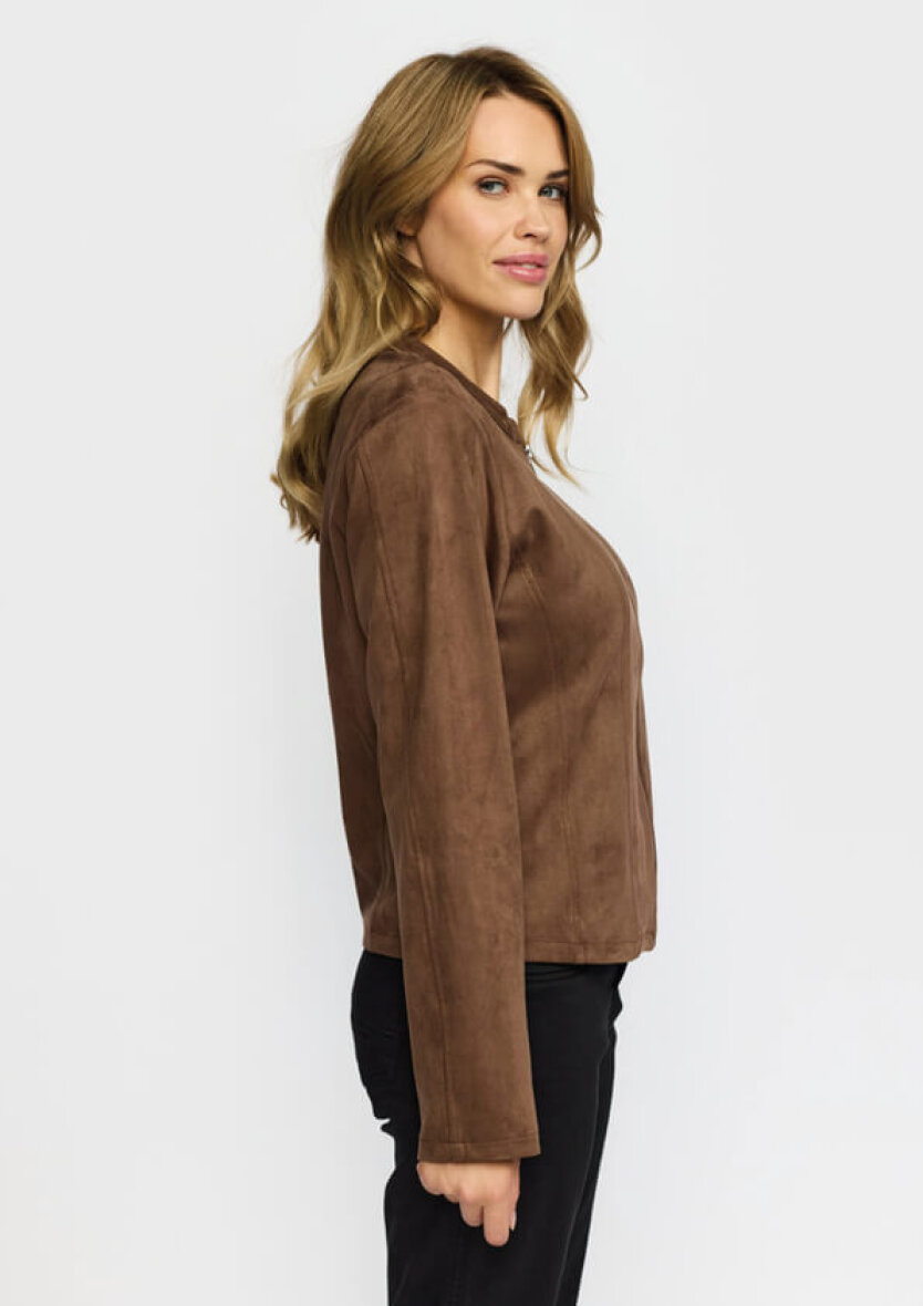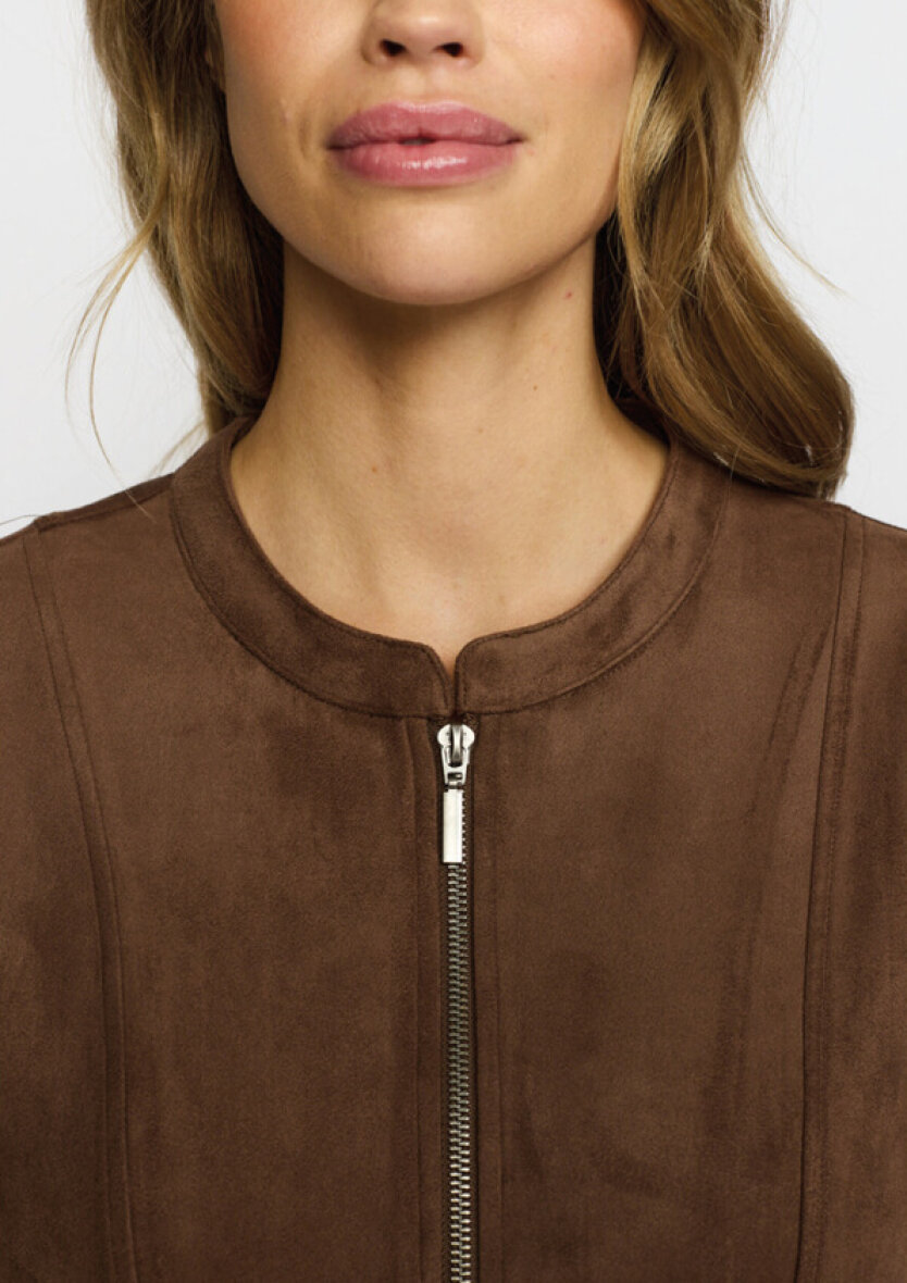 2-Biz jakke i modellen PENNY er fremstillet i et blødt brunt ruskindslook, der giver et elegant og moderne udtryk.