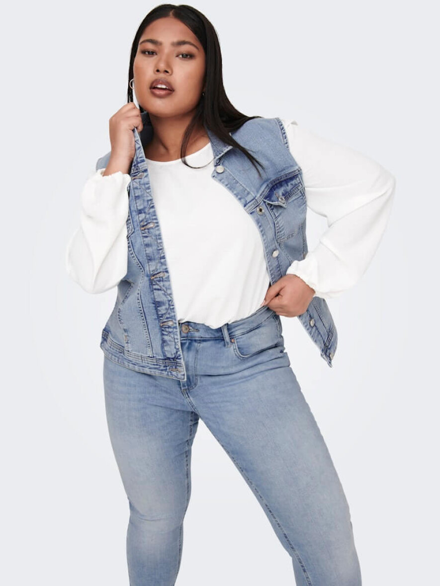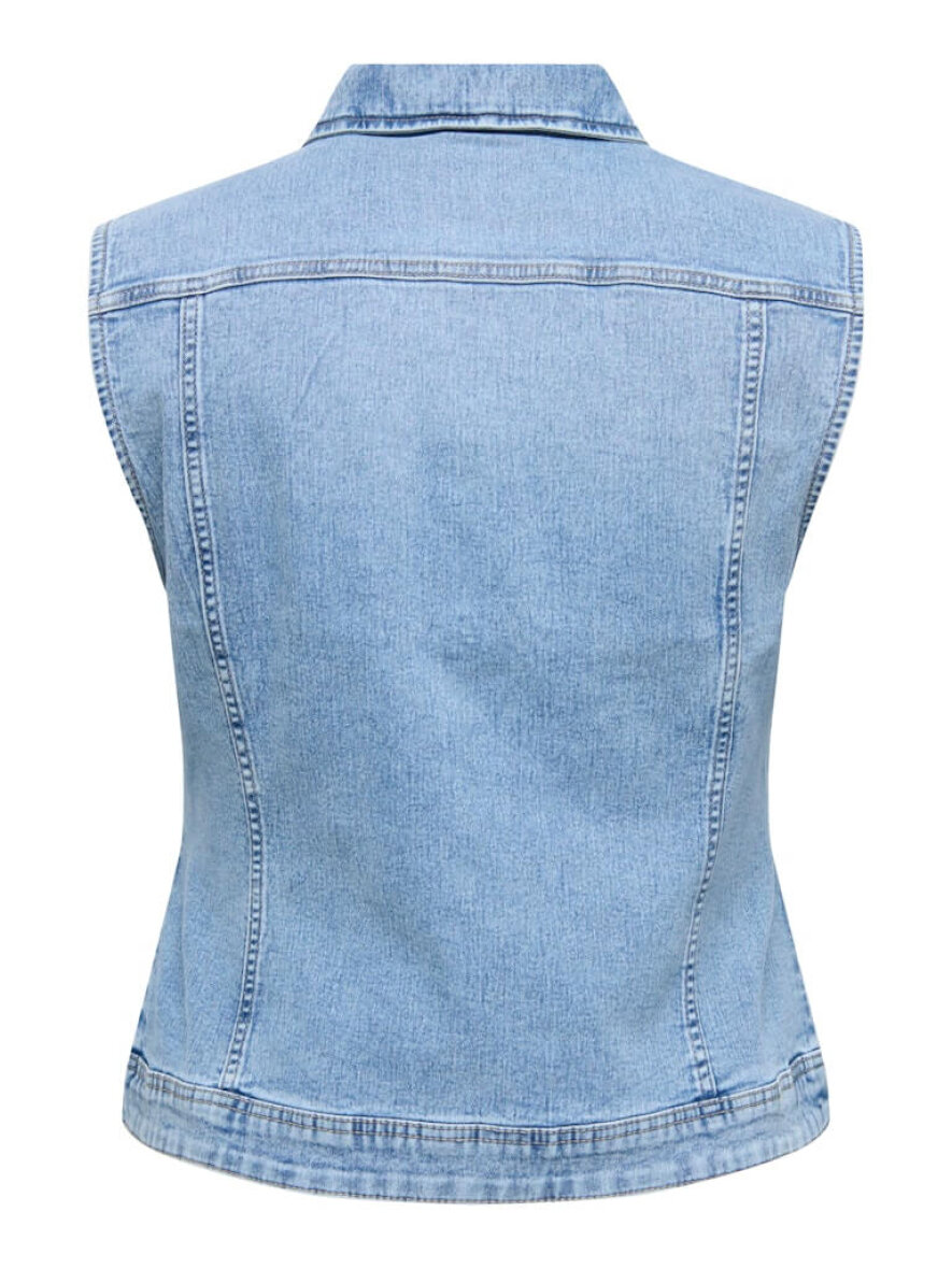 Only Carmakoma denim vest i en flot og alsidig lyseblå denim farve. En denimvest er et tidløst modeelement, der giver ethvert outfit et cool, afslappet udtryk.