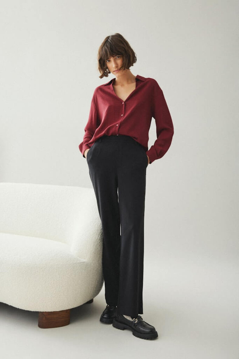 Det glatte materiale falder pænt langs benene og giver et sofistikeret look – perfekt til kontoret, middage eller en stilfuld hverdagsgarderobe.