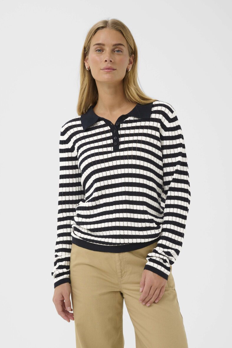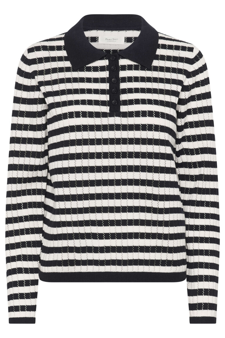 Part Two strikbluse i et tidløst design med en behagelig pasform. Strikken er designet i et fintmasket mønster i mørkeblå og cremefarvede striber, som giver et sofistikeret, men afslappet udtryk.