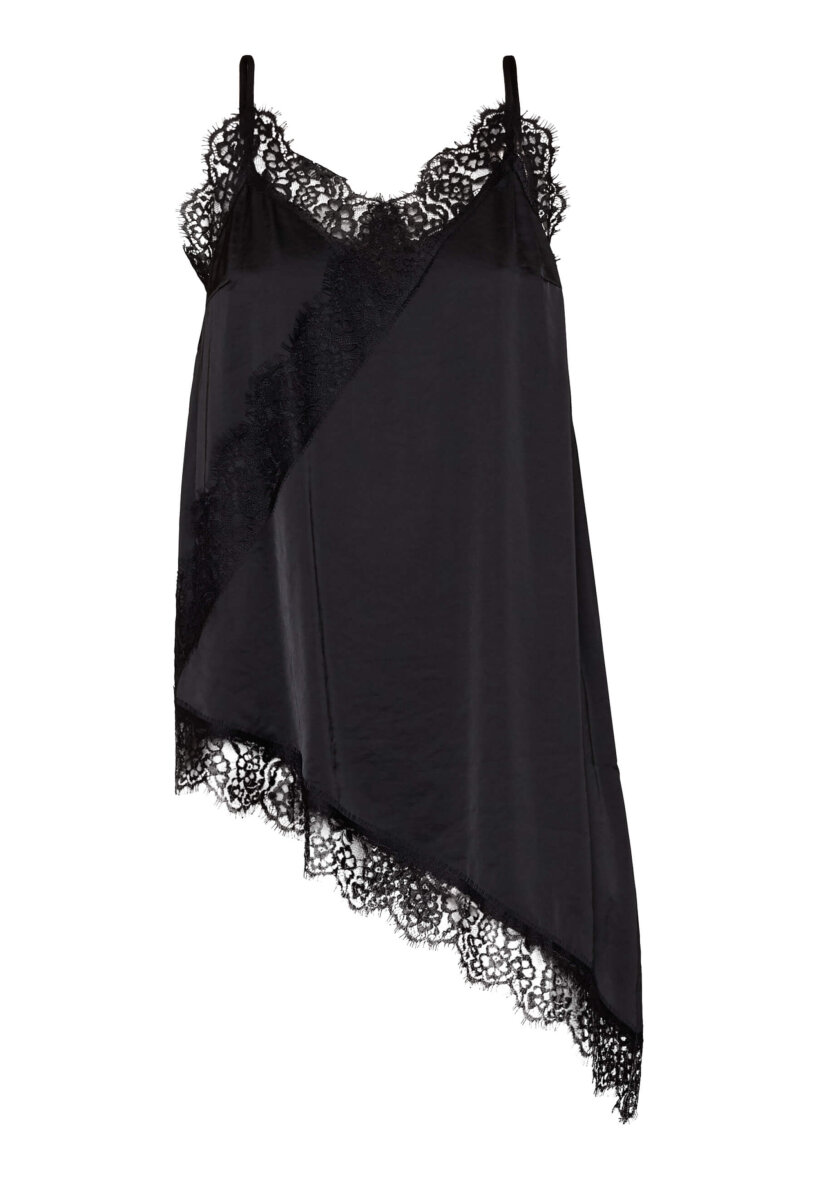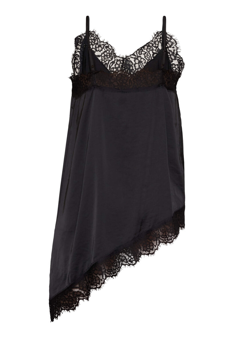 Love & Divine kjole top med en kombination af et feminint udtryk med et moderne, afslappet look. Den er lavet i et glansfuldt, let satinlignende materiale og har fine blondekanter langs udskæringen og den asymmetriske underkant.