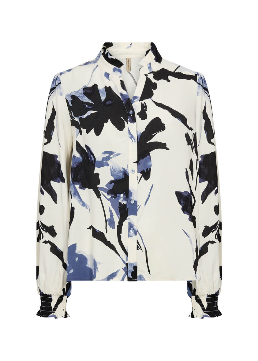 Soyaconcept skjorte bluse i en lys sandfarvet base og et charmerende blomsterprint i blå nuancer og sort.