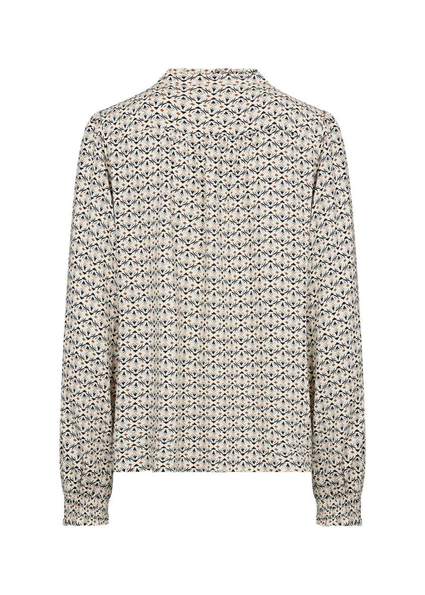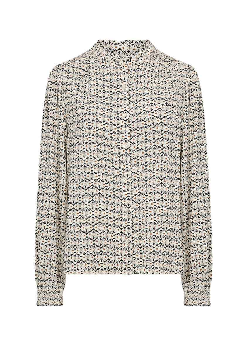 Soyaconcept bluse i et flot geometrisk print i en farvekombination af brun, sort og blå nuancer.