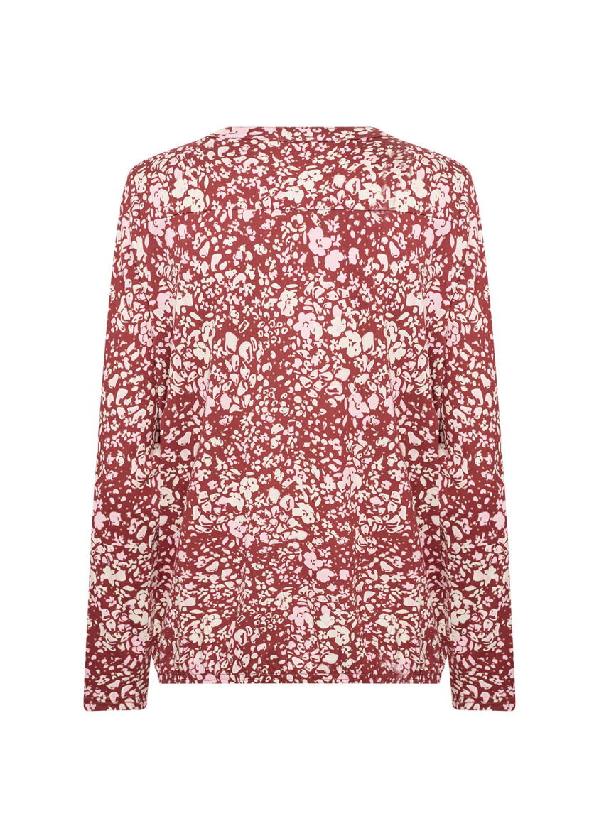 Soyaconcept bluse i et yndefuldt blomster print i et flot mix af rosa og røde nuancer. FELICITY blusen er med v-halsudskæring, stolpeluk og lange ærmer.