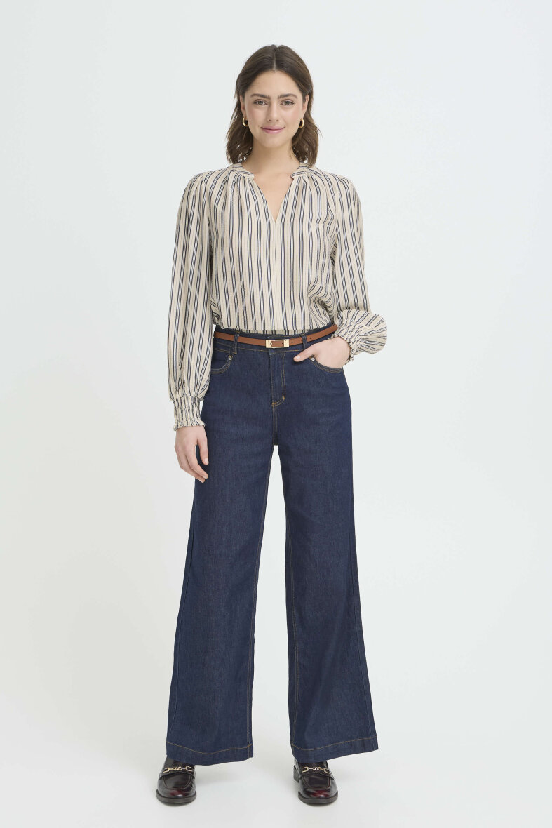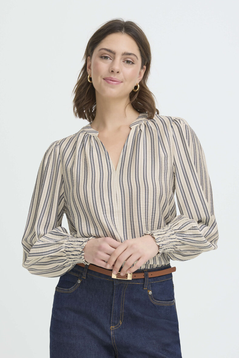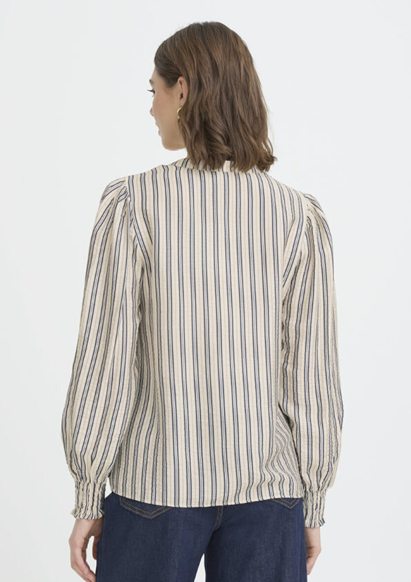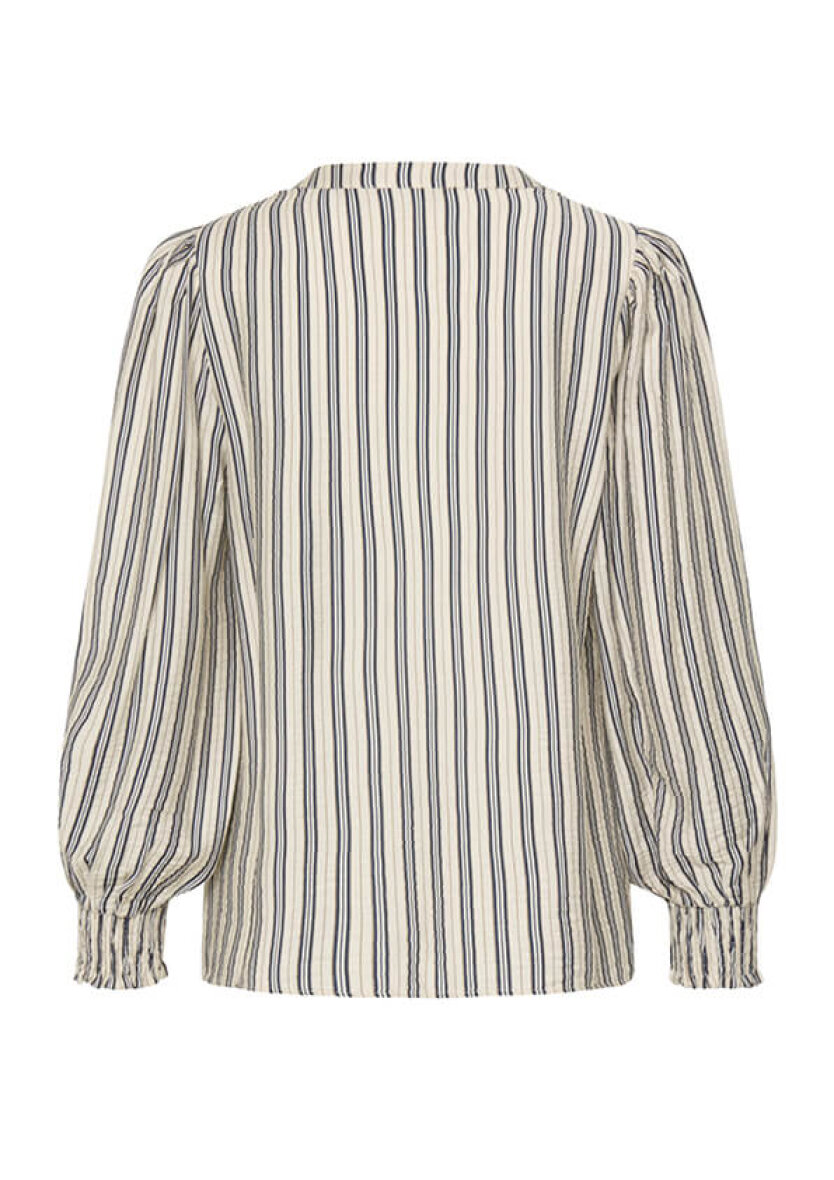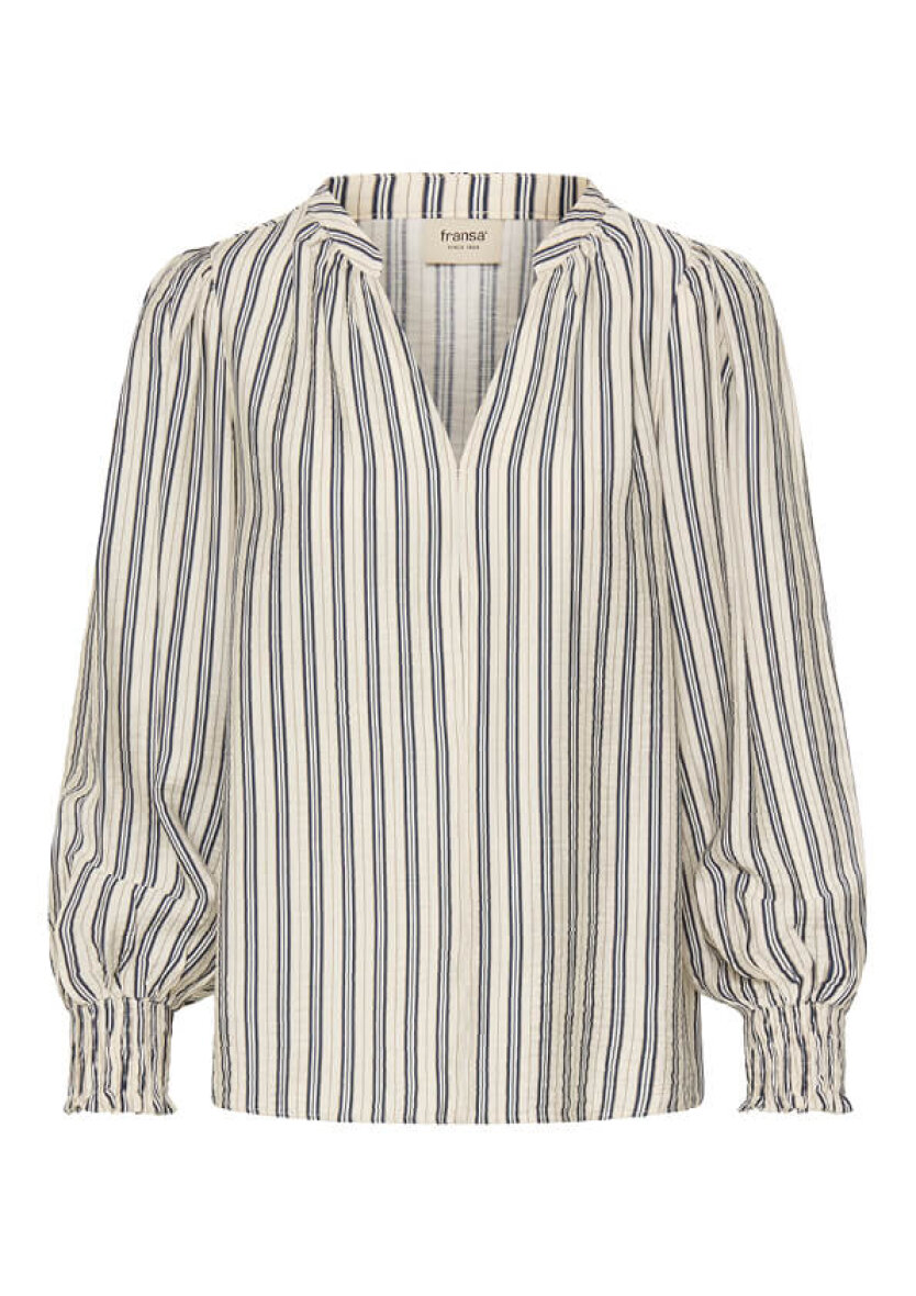 FRANSA bluse i et elegant stribet design. Blusen er med en dyb v-halsudskæring og en diskret lodret stiknings detalje langs fronten. Fransa blusen er lange ærmer med let put ved skuldrene og afsluttes med smock ved håndleddet.