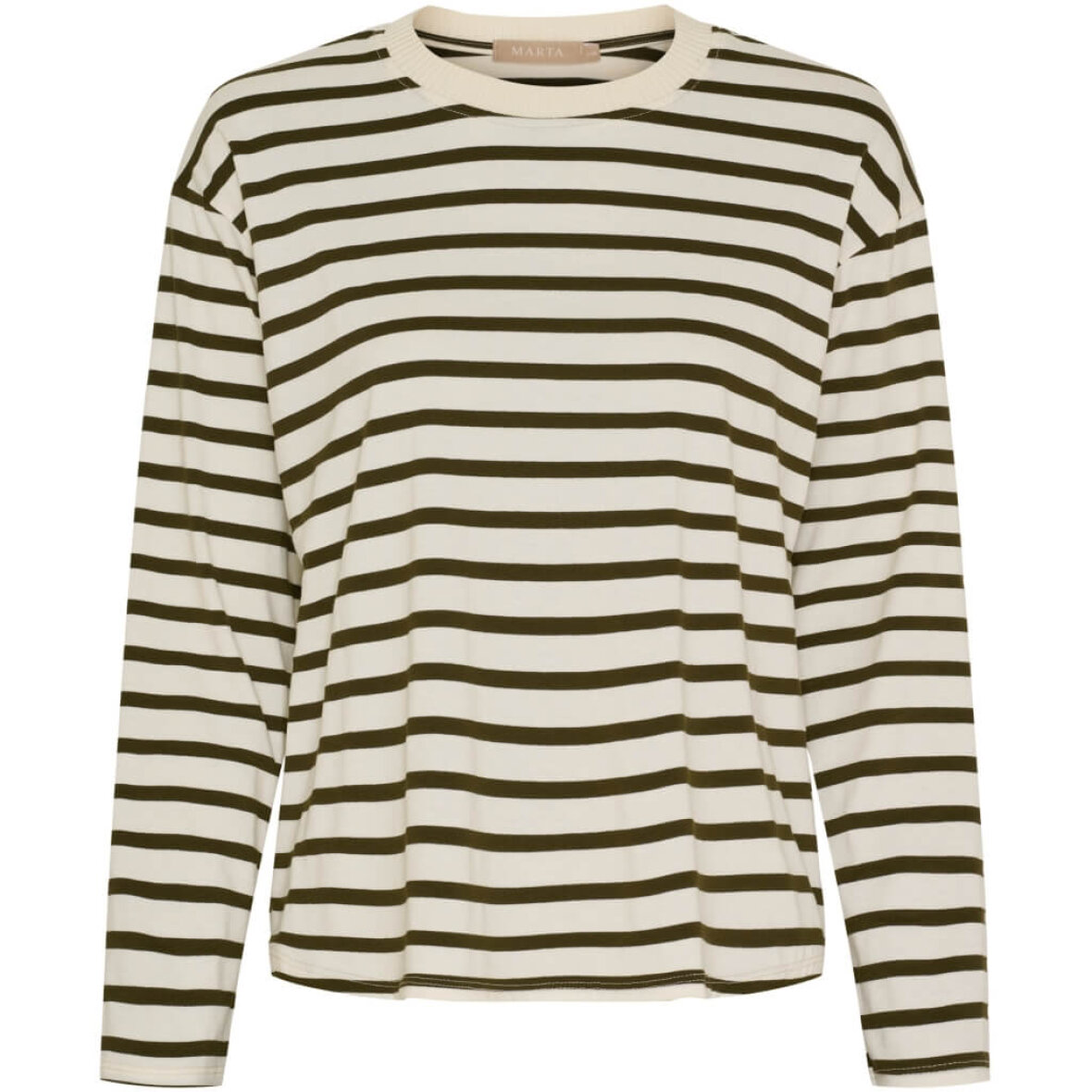 Marta Du Chateau bluse i et flot knækket hvid/oliven grøn stribet print. Det stribet design er nemt at style med diverse underdele og gør sig altid godt i basisgarderoben.