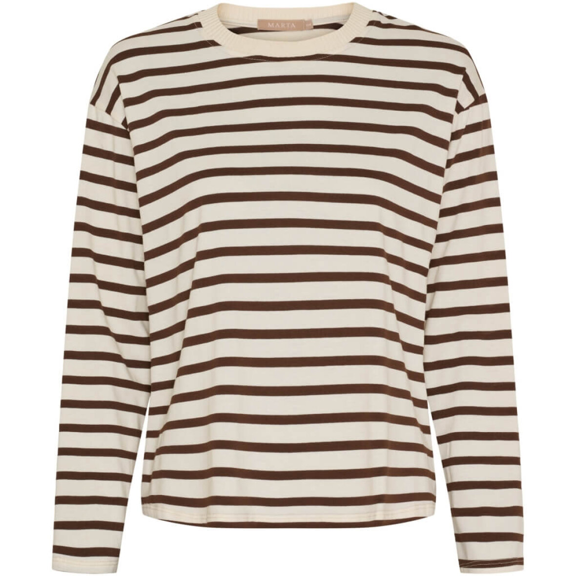 Marta Du Chateau bluse i et flot knækket hvid/brun stribet print. Det stribet design er nemt at style med diverse underdele og gør sig altid godt i basisgarderoben.