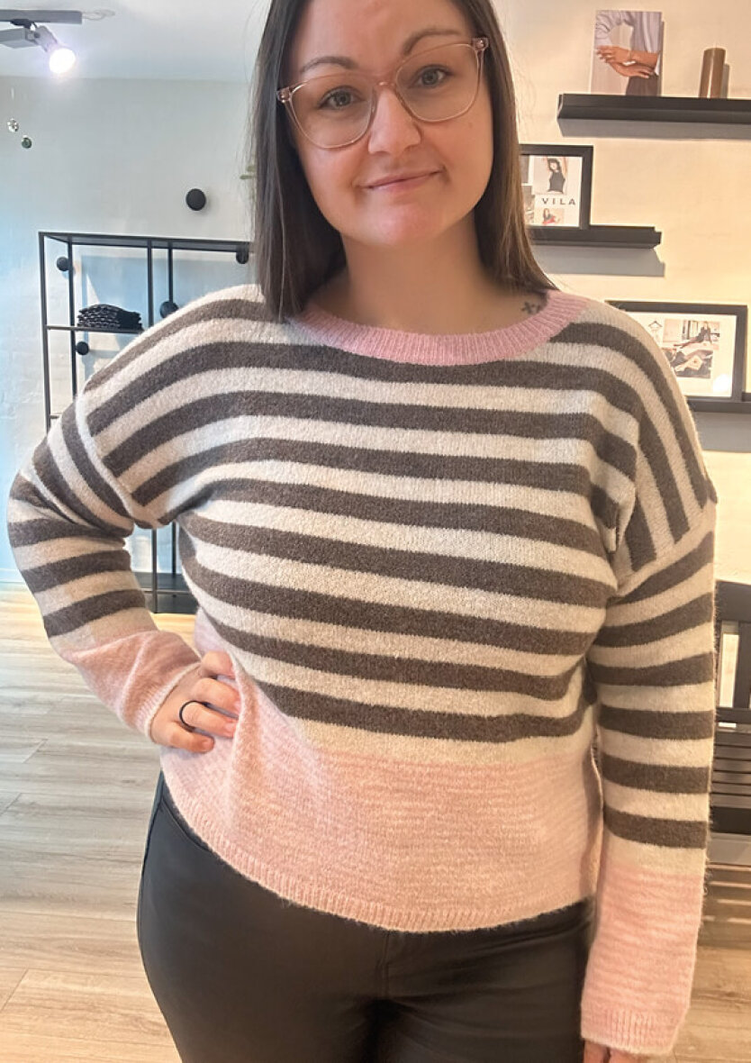 Strikken skiller sig ud med sine kontrastdetaljer: Den lyserøde ribkant ved halsåbningen går igen ved ærmerne og nederst på trøjen i et smalt stribet mønster.