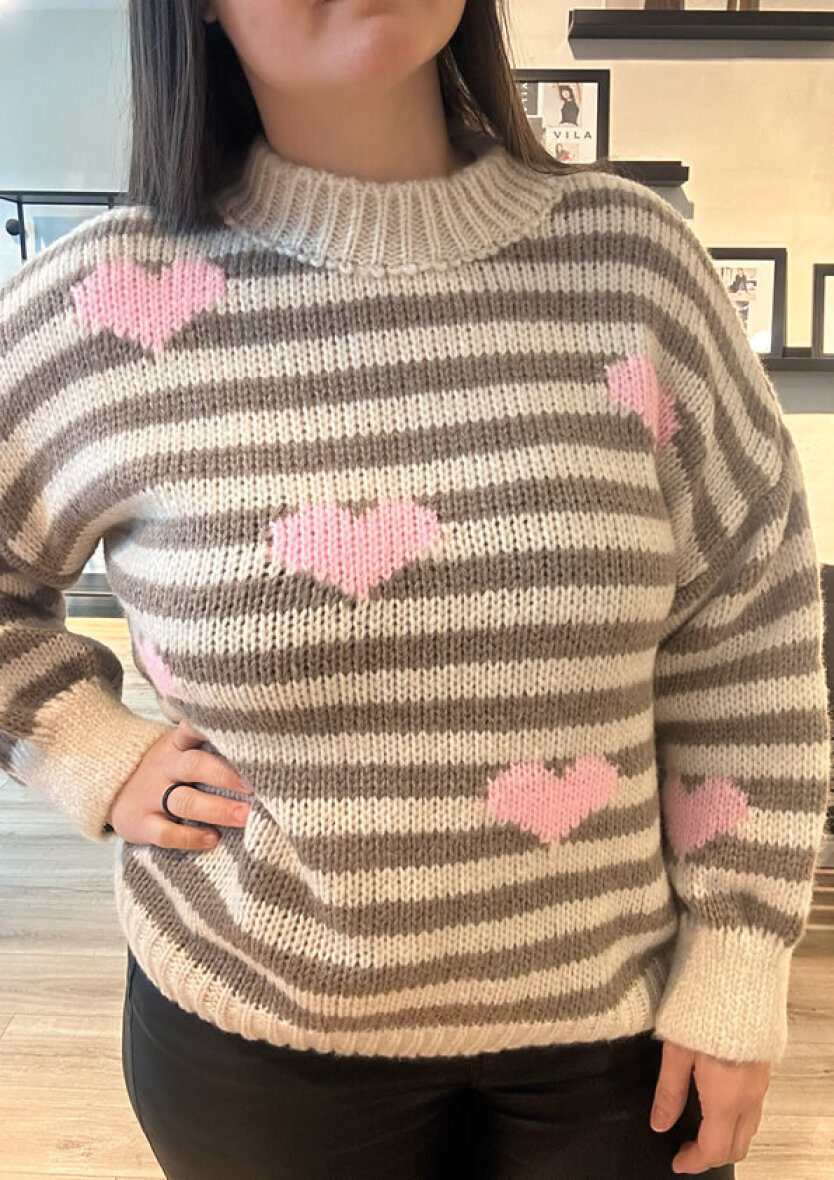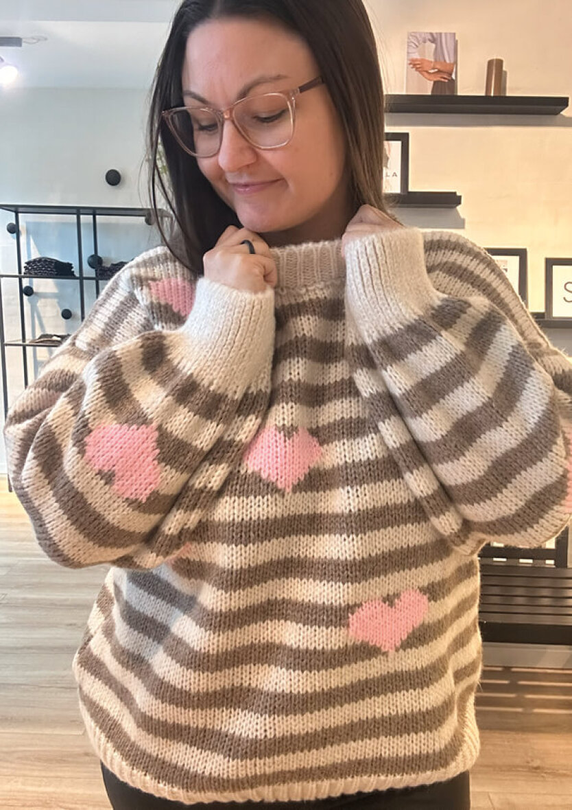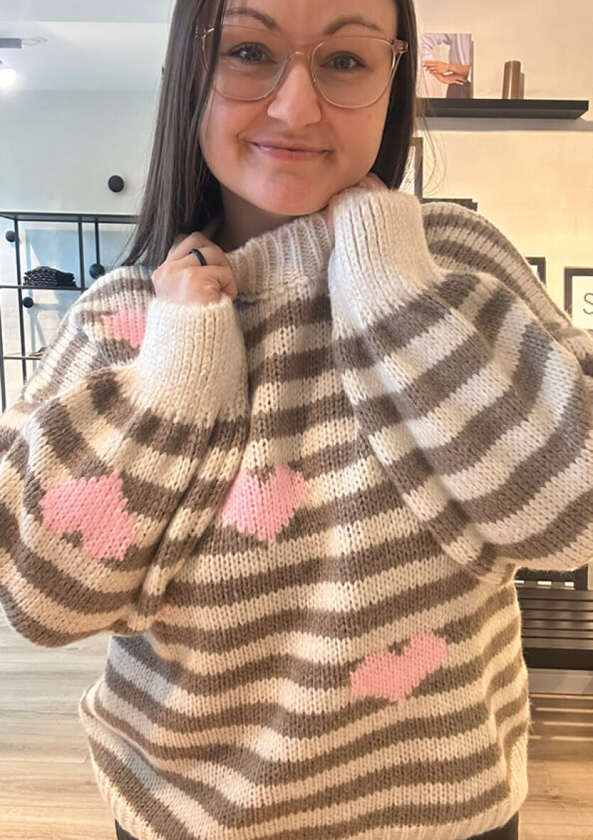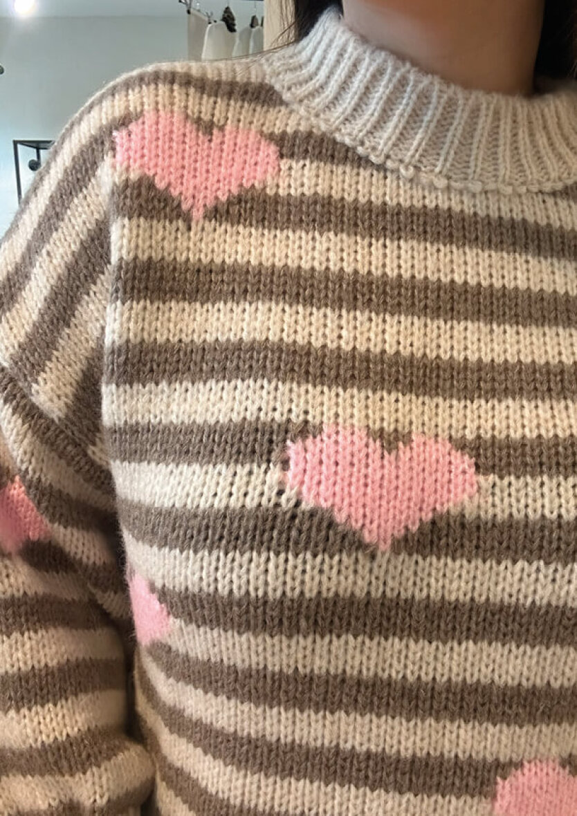 Denne striktrøje fra Marta Du Chateau er den perfekte kombination af klassisk design og feminine detaljer. Strikken er lavet i en lys cremefarve med lysebrune striber og iøjefaldende lyserøde hjerter på fronten.