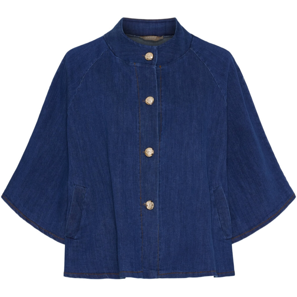 Jakken er med høj rund hals og store markante sølv knapper langs fronten. De korte ærmer er med et bred snit, som tilføjer god bevægelsesfrihed. Med lommer i siderne.