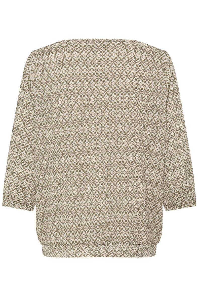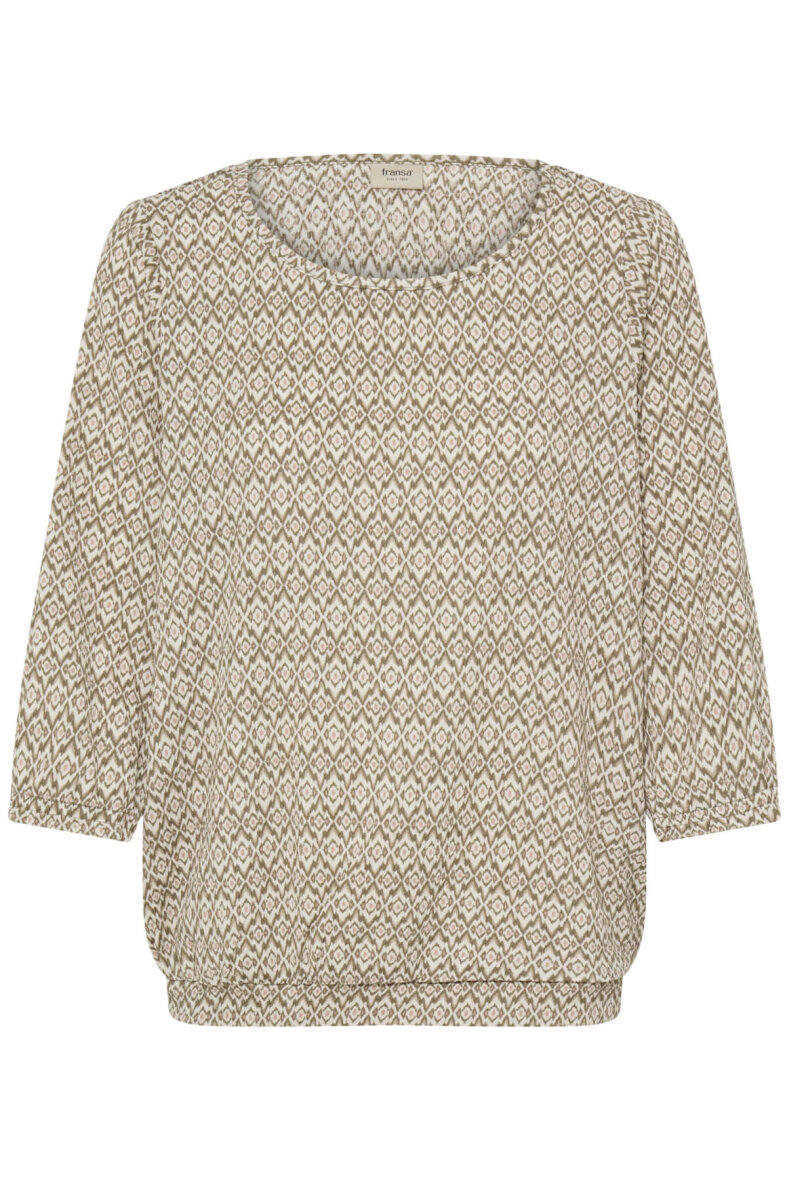 FRANSA bluse i et flot grafisk mønster i oliven grønne toner med orange detaljer.