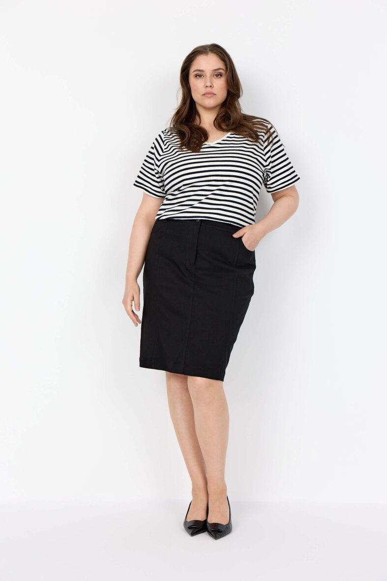 Wasabiconcept t-shirt i et klassisk sort/hvid stribet design. En stribet t-shirt er en tidløs klassiker, der passer ind i enhver garderobe – uafhængigt af sæson og anledning. Uanset om du går efter et afslappet hverdagslook eller vil tilføje lidt kant til et mere elegant outfit, er striber et sikkert valg.