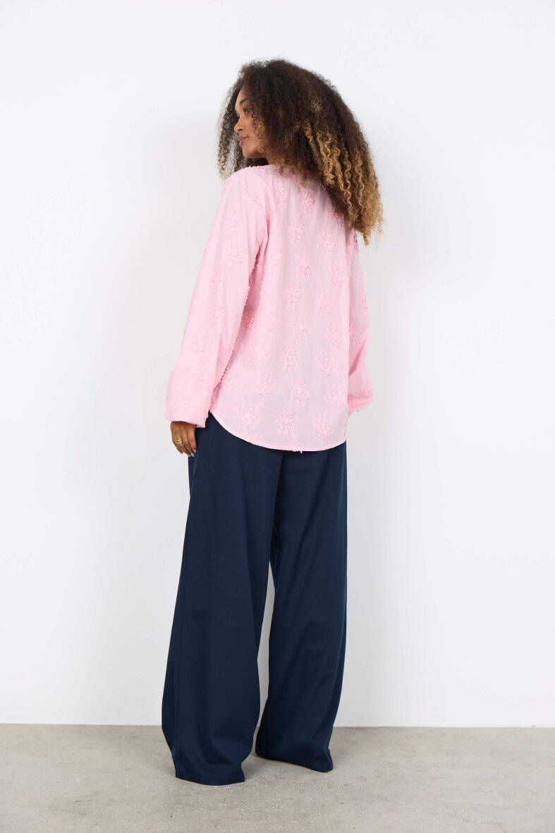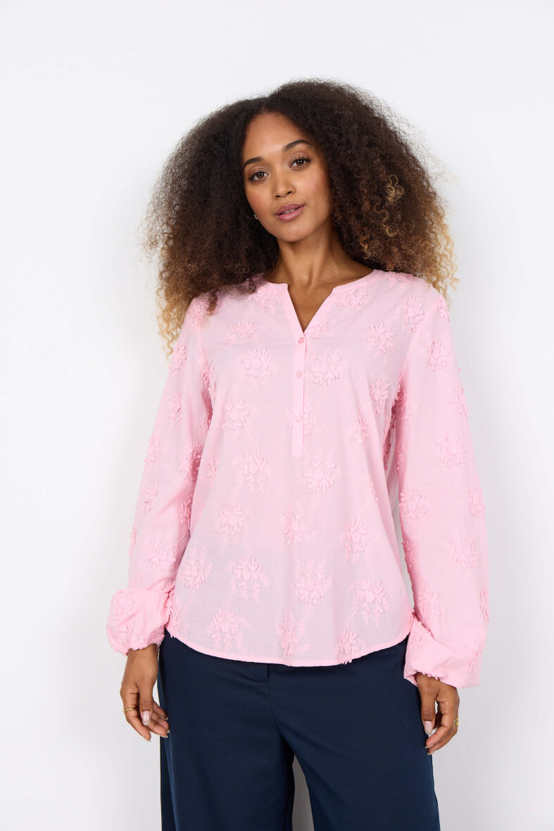 Soyaconcept bluse i en feminin lyserød farve med det fineste broderet blomster i matchende lyserøde farve all-over. Et elegant touch, som skaber struktur i stoffet.