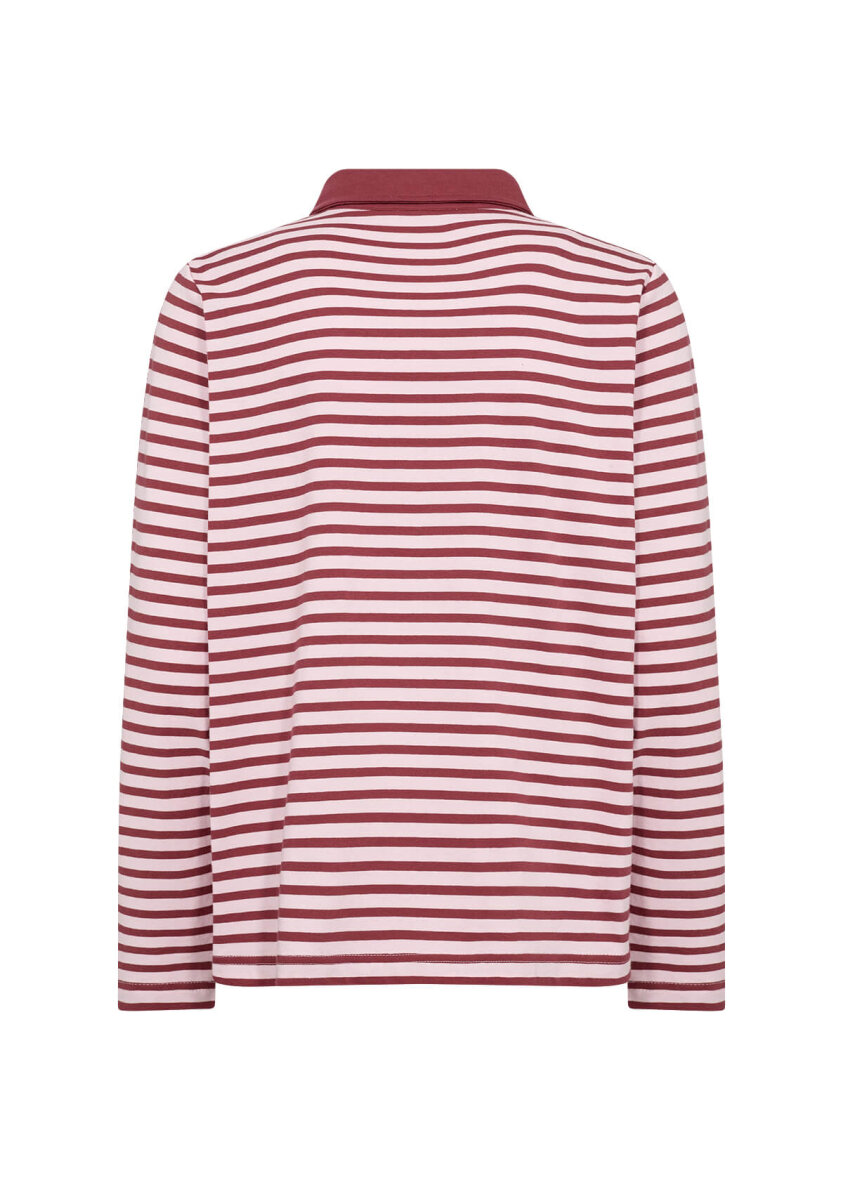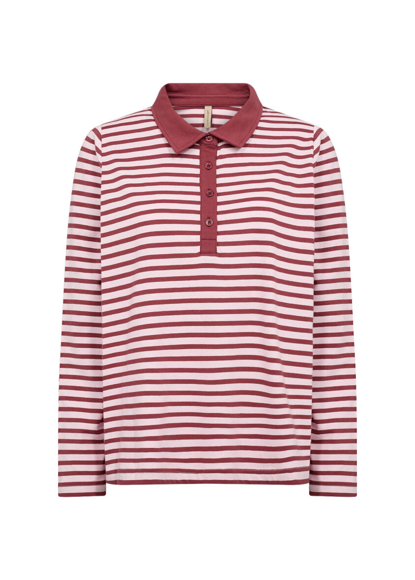 Soyaconcept poloshirt i modellen BRI. Sporty møder klassisk i denne stribede bluse i røde og rosa farver.