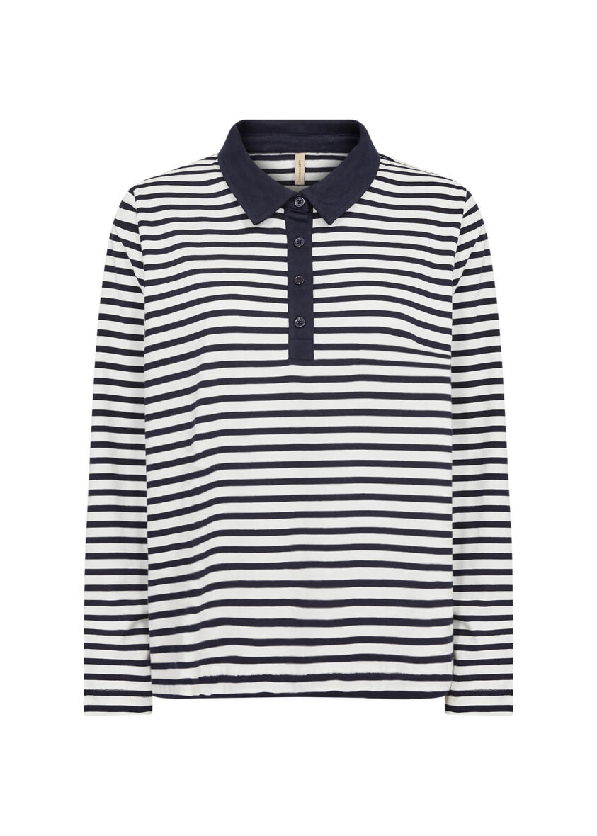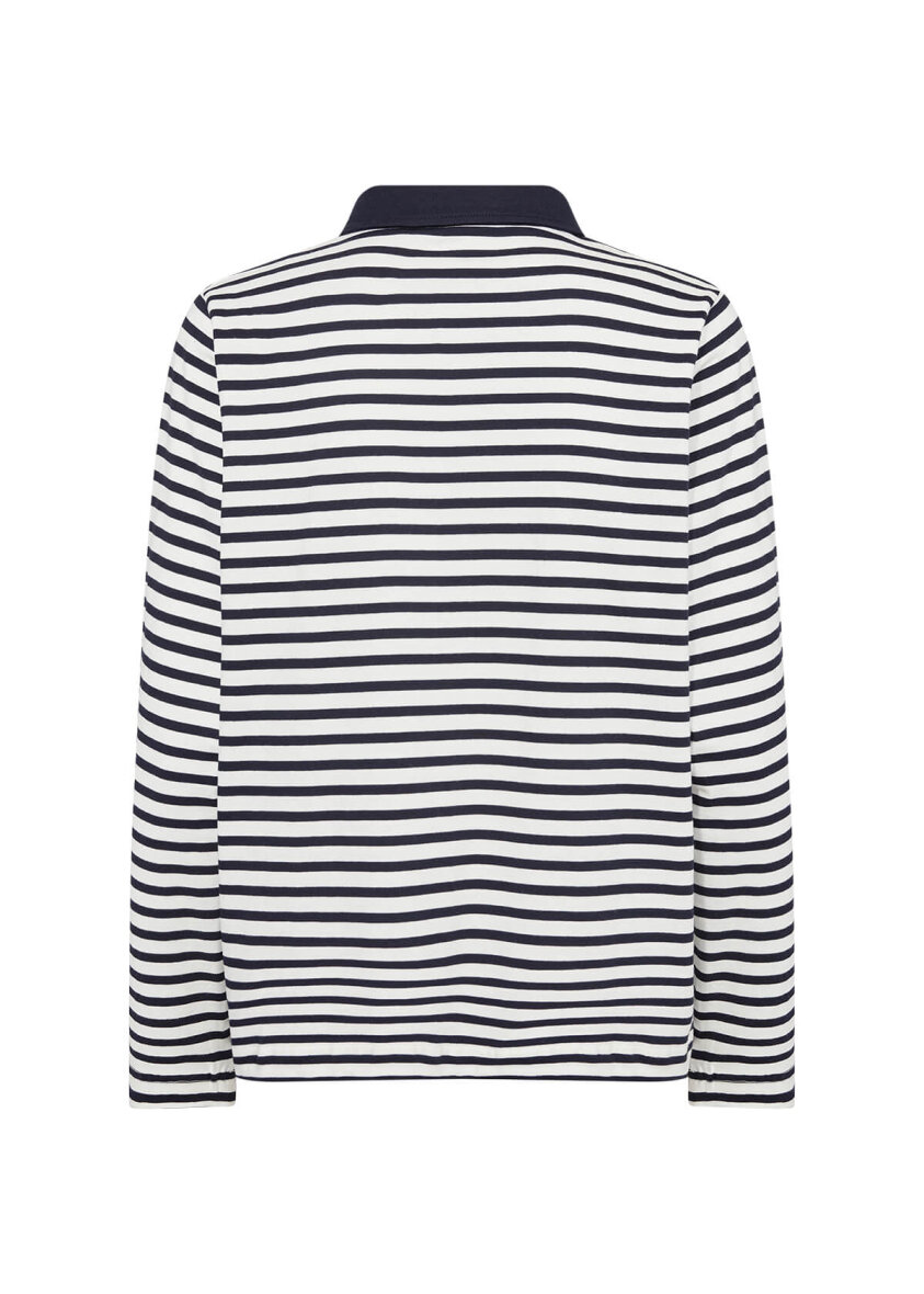 Soyaconcept poloshirt i modellen BRI. Sporty møder klassisk i denne stribede bluse i hvide og mørkeblå striber.