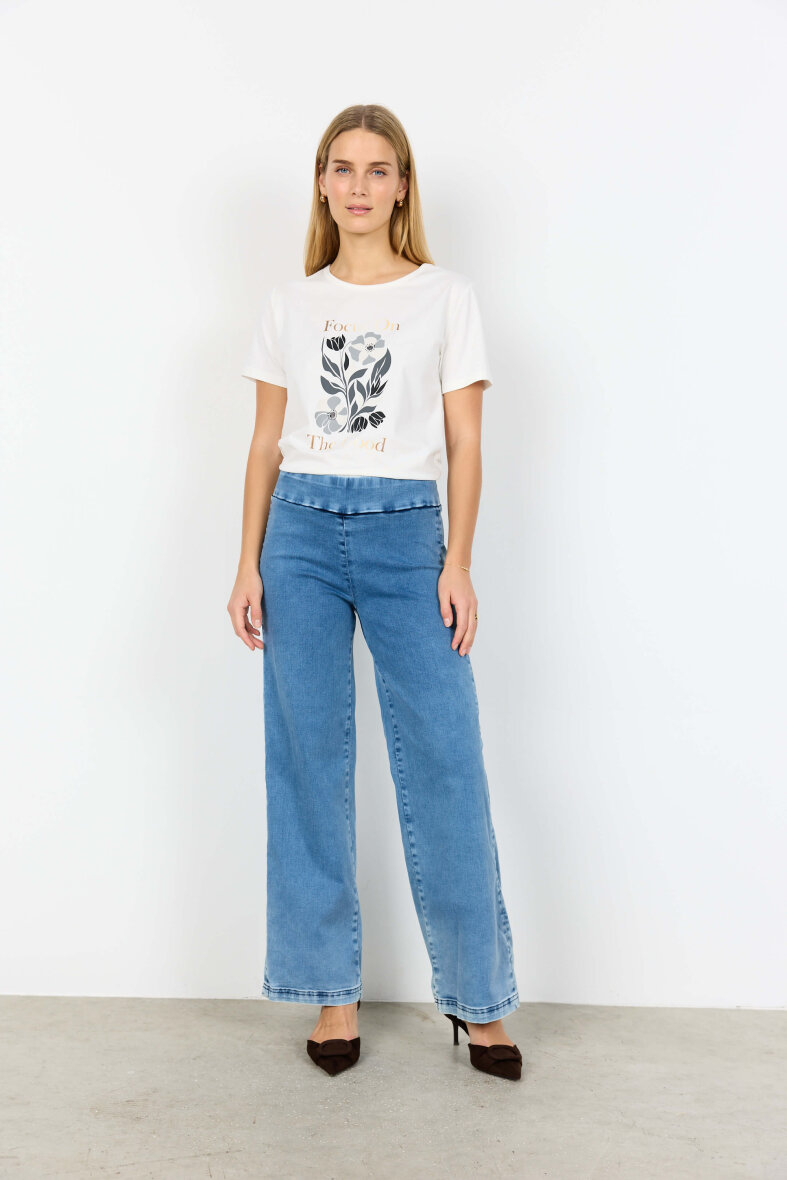 Soyaconcept buks i en alsidig blå denim farve. En højtaljet buks med elastik i taljen, som giver et glat finish.