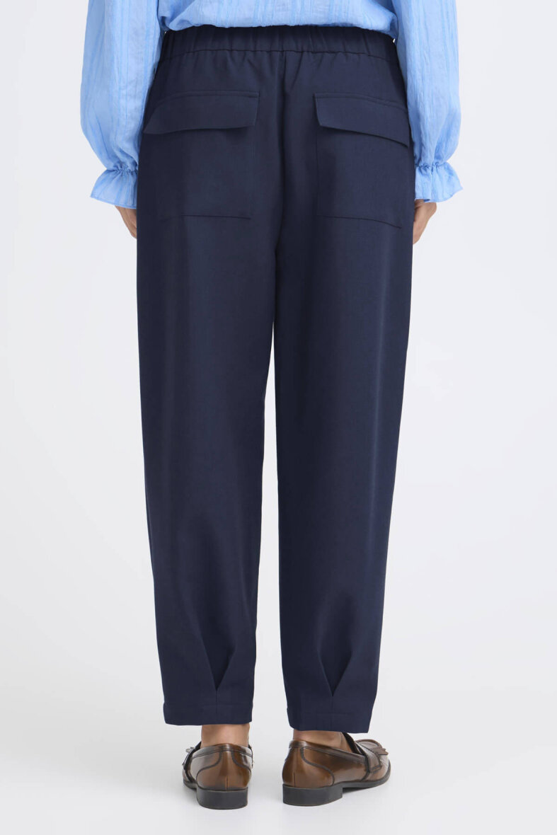 Buksen er med elastik i taljen bagpå og fast linning med knapluk og lynlås foran. Med åbne sidelommer og baglommer med flap.