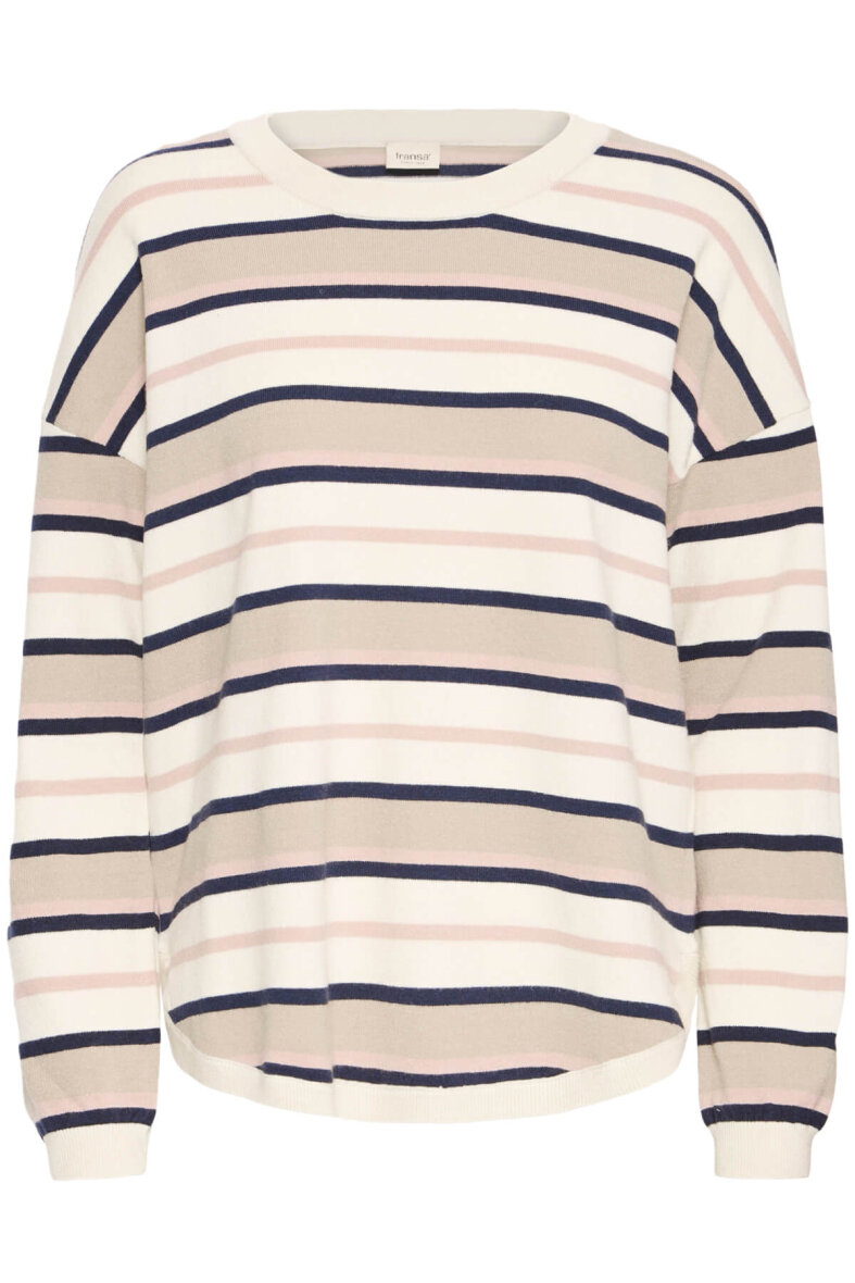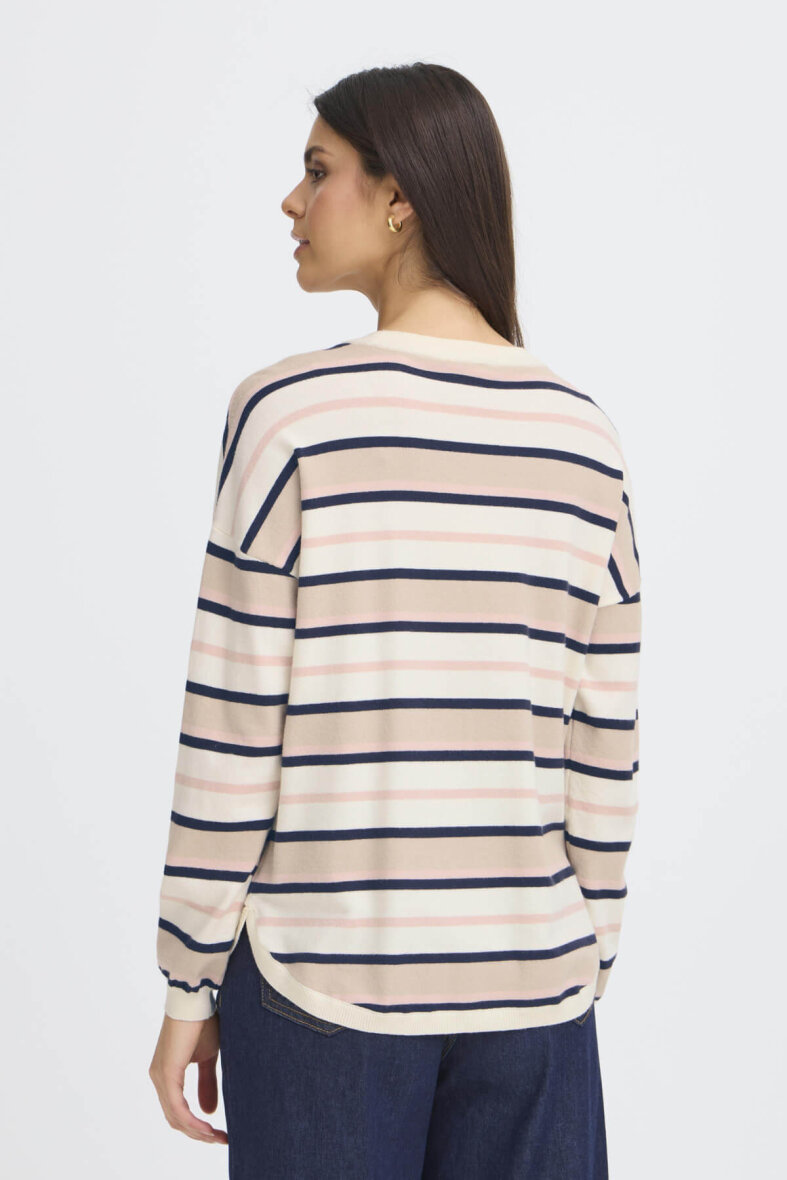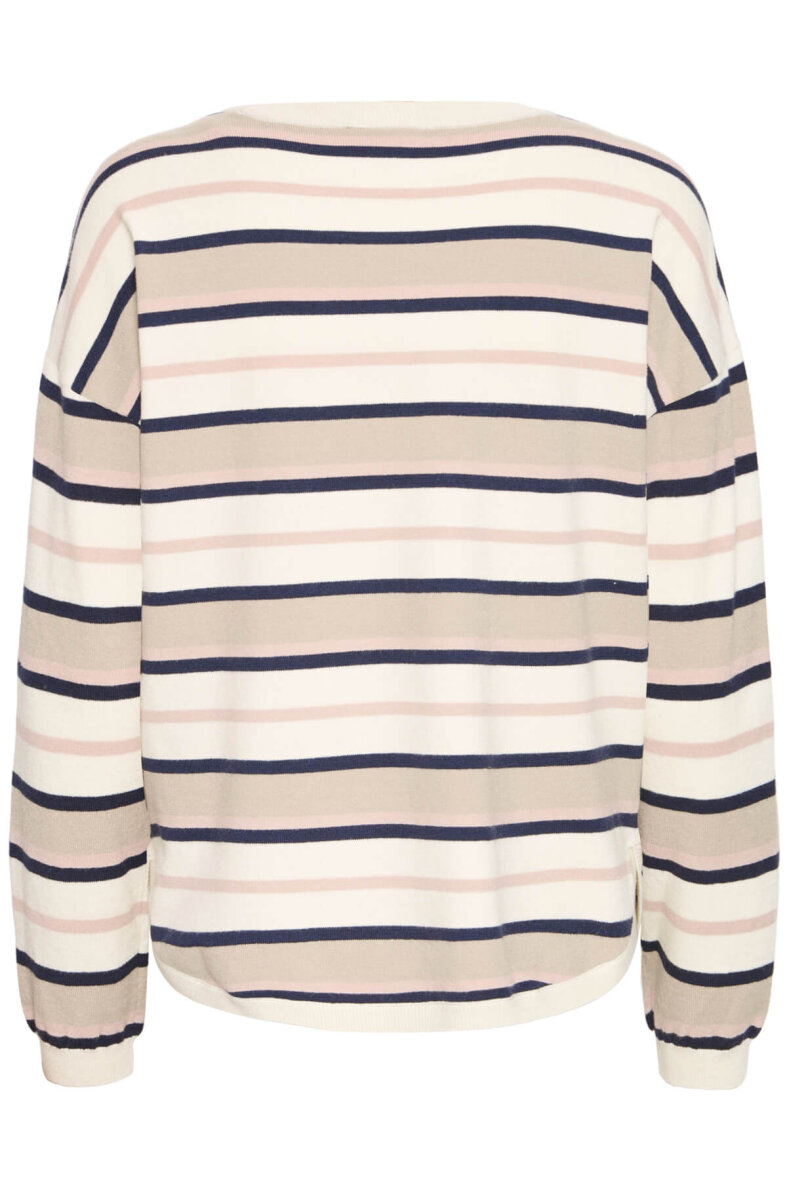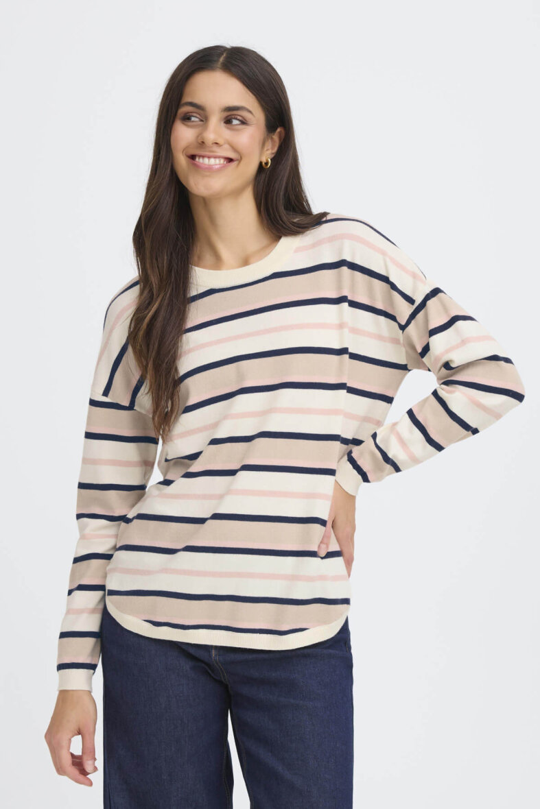 FRANSA striktrøje i en flot lys creme farve med et stribet design – en klassiker, der er nem at style til det meste. Strikken er lavet i en blød og behagelig blanding, som gør den skøn at have på. Perfekt som et lunt lag på kølige dage, og nem at style over skjorter, kjoler eller til dine yndlingsjeans. De rosa, beige og sorte striber giver et roligt og naturligt udtryk, som holder sæson efter sæson.