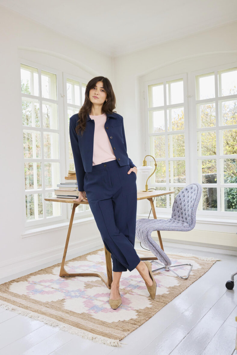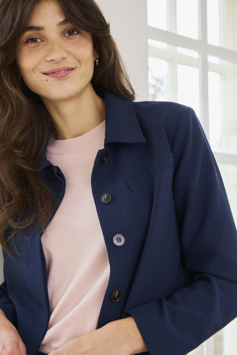 Brug den blå blazer over en skjorte eller bluse til arbejde – eller kombinér den med en enkel top for et afslappet, men stadig velklædt outfit. Style evt. med matchende bukser for et formelt og stilrent look.